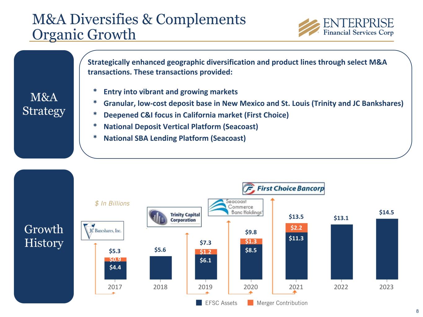 $2.4 $2.8 $3.2 $4.1 $4.4 $5.3 $7.2 $9.0 $9.7 $10.9 $11.0 $2.5 $2.8 $3.2 $4.2 $4.6 $5.8 $8.0 $11.3 $10.8 $12.2 $12.3 EFSC Loans Acquired Loans EFSC Deposits Acquired Deposits 2014 2015 2016 2017 2018 2019 2020 2021 2022 2023 2Q24 $ In Billions 17.4 % 1 0 yr Dep osit Gro wth CAG R1 (11. 5% 1 exc ludi ng a cqu isiti ons and bro kere d CD s)16.6 % 1 0 yr Loa n Gr owt h CA GR 1 (10. 5% 1 exc ludi ng a cqu isiti ons ) Loan and Deposit Trends 110 yr CAGR from 2Q14 - 2Q24 7