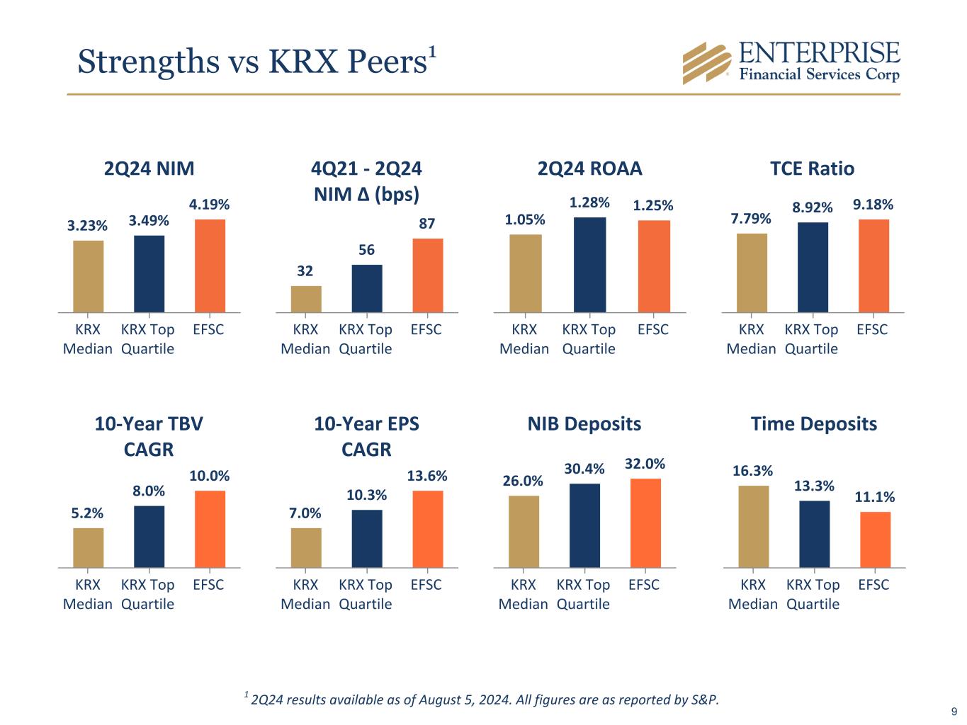 Strengths vs KRX Peers1 2Q24 NIM 3.23% 3.49% 4.19% KRX Median KRX Top Quartile EFSC 10-Year TBV CAGR 5.2% 8.0% 10.0% KRX Median KRX Top Quartile EFSC 10-Year EPS CAGR 7.0% 10.3% 13.6% KRX Median KRX Top Quartile EFSC NIB Deposits 26.0% 30.4% 32.0% KRX Median KRX Top Quartile EFSC Time Deposits 16.3% 13.3% 11.1% KRX Median KRX Top Quartile EFSC 2Q24 ROAA 1.05% 1.28% 1.25% KRX Median KRX Top Quartile EFSC 1 2Q24 results available as of August 5, 2024. All figures are as reported by S&P. 4Q21 - 2Q24 NIM ∆ (bps) 32 56 87 KRX Median KRX Top Quartile EFSC TCE Ratio 7.79% 8.92% 9.18% KRX Median KRX Top Quartile EFSC 9