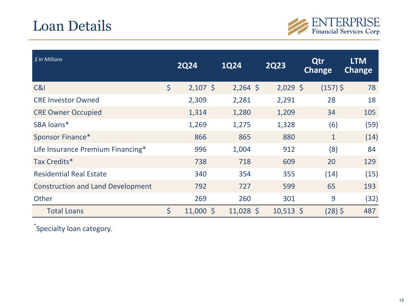 Loan Details 2Q24 1Q24 2Q23 Qtr Change LTM Change C&I $ 2,107 $ 2,264 $ 2,029 $ (157) $ 78 CRE Investor Owned 2,309 2,281 2,291 28 18 CRE Owner Occupied 1,314 1,280 1,209 34 105 SBA loans* 1,269 1,275 1,328 (6) (59) Sponsor Finance* 866 865 880 1 (14) Life Insurance Premium Financing* 996 1,004 912 (8) 84 Tax Credits* 738 718 609 20 129 Residential Real Estate 340 354 355 (14) (15) Construction and Land Development 792 727 599 65 193 Other 269 260 301 9 (32) Total Loans $ 11,000 $ 11,028 $ 10,513 $ (28) $ 487 *Specialty loan category. $ In Millions 15
