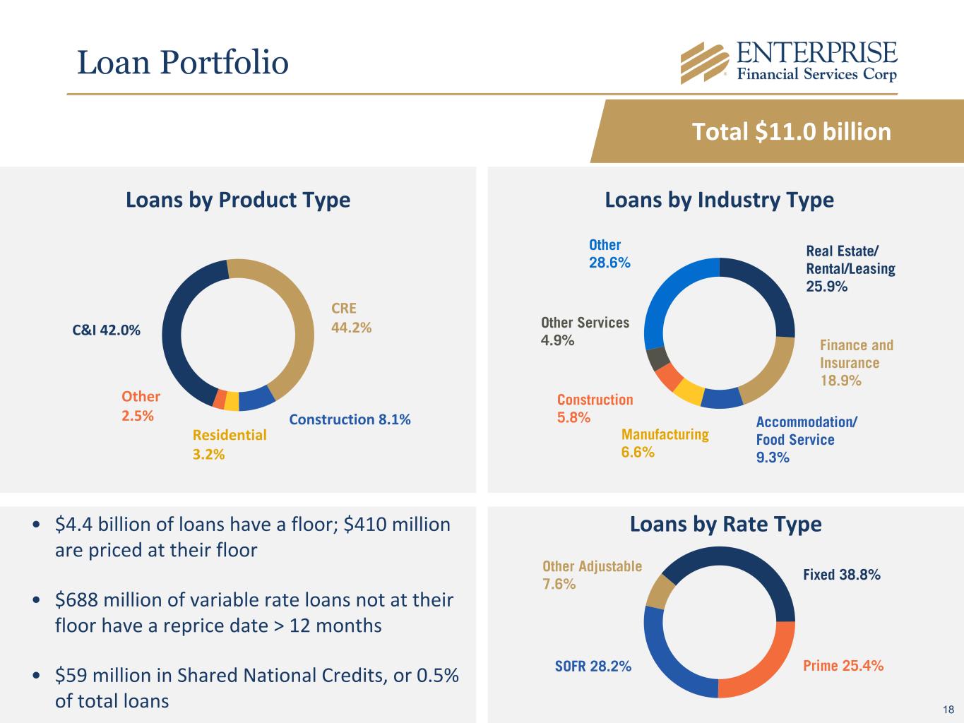Loan Portfolio Total $11.0 billion C&I 42.0% CRE 44.2% Construction 8.1% Residential 3.2% Other 2.5% Loans by Product Type Real Estate/ Rental/Leasing 25.9% Finance and Insurance 18.9% Accommodation/ Food Service 9.3% Manufacturing 6.6% Construction 5.8% Other Services 4.9% Other 28.6% Loans by Industry Type Fixed 38.8% Prime 25.4%SOFR 28.2% Other Adjustable 7.6% Loans by Rate Type• $4.4 billion of loans have a floor; $410 million are priced at their floor • $688 million of variable rate loans not at their floor have a reprice date > 12 months • $59 million in Shared National Credits, or 0.5% of total loans 18
