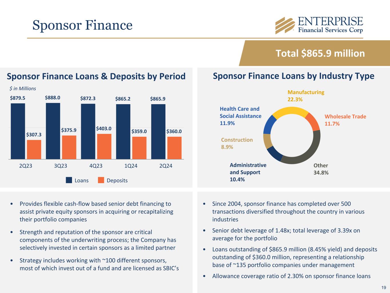Sponsor Finance Administrative and Support 10.4% Construction 8.9% Health Care and Social Assistance 11.9% Manufacturing 22.3% Wholesale Trade 11.7% Other 34.8% Sponsor Finance Loans by Industry TypeSponsor Finance Loans & Deposits by Period $879.5 $888.0 $872.3 $865.2 $865.9 $307.3 $375.9 $403.0 $359.0 $360.0 Loans Deposits 2Q23 3Q23 4Q23 1Q24 2Q24 • Provides flexible cash-flow based senior debt financing to assist private equity sponsors in acquiring or recapitalizing their portfolio companies • Strength and reputation of the sponsor are critical components of the underwriting process; the Company has selectively invested in certain sponsors as a limited partner • Strategy includes working with ~100 different sponsors, most of which invest out of a fund and are licensed as SBIC’s $ in Millions • Since 2004, sponsor finance has completed over 500 transactions diversified throughout the country in various industries • Senior debt leverage of 1.48x; total leverage of 3.39x on average for the portfolio • Loans outstanding of $865.9 million (8.45% yield) and deposits outstanding of $360.0 million, representing a relationship base of ~135 portfolio companies under management • Allowance coverage ratio of 2.30% on sponsor finance loans Total $865.9 million 19