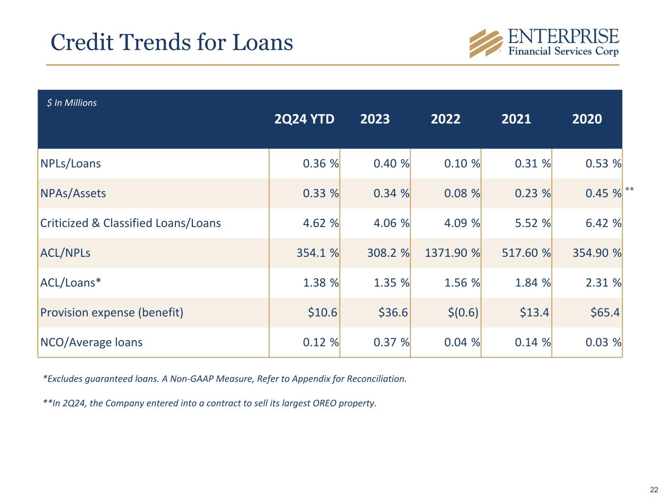 Credit Trends for Loans 2Q24 YTD 2023 2022 2021 2020 NPLs/Loans 0.36 % 0.40 % 0.10 % 0.31 % 0.53 % NPAs/Assets 0.33 % 0.34 % 0.08 % 0.23 % 0.45 % Criticized & Classified Loans/Loans 4.62 % 4.06 % 4.09 % 5.52 % 6.42 % ACL/NPLs 354.1 % 308.2 % 1371.90 % 517.60 % 354.90 % ACL/Loans* 1.38 % 1.35 % 1.56 % 1.84 % 2.31 % Provision expense (benefit) $10.6 $36.6 $(0.6) $13.4 $65.4 NCO/Average loans 0.12 % 0.37 % 0.04 % 0.14 % 0.03 % *Excludes guaranteed loans. A Non-GAAP Measure, Refer to Appendix for Reconciliation. **In 2Q24, the Company entered into a contract to sell its largest OREO property. $ In Millions ** 22
