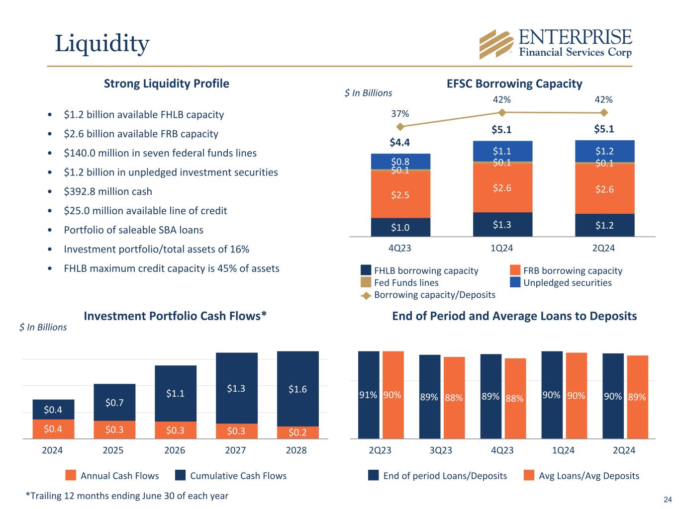 EFSC Borrowing Capacity $4.4 $5.1 $5.1 $1.0 $1.3 $1.2 $2.5 $2.6 $2.6 $0.1 $0.1 $0.1$0.8 $1.1 $1.2 37% 42% 42% FHLB borrowing capacity FRB borrowing capacity Fed Funds lines Unpledged securities Borrowing capacity/Deposits 4Q23 1Q24 2Q24 $ In Billions End of Period and Average Loans to Deposits 91% 89% 89% 90% 90%90% 88% 88% 90% 89% End of period Loans/Deposits Avg Loans/Avg Deposits 2Q23 3Q23 4Q23 1Q24 2Q24 • $1.2 billion available FHLB capacity • $2.6 billion available FRB capacity • $140.0 million in seven federal funds lines • $1.2 billion in unpledged investment securities • $392.8 million cash • $25.0 million available line of credit • Portfolio of saleable SBA loans • Investment portfolio/total assets of 16% • FHLB maximum credit capacity is 45% of assets $0.4 $0.3 $0.3 $0.3 $0.2 $0.4 $0.7 $1.1 $1.3 $1.6 Annual Cash Flows Cumulative Cash Flows 2024 2025 2026 2027 2028 Investment Portfolio Cash Flows* $ In Billions Strong Liquidity Profile *Trailing 12 months ending June 30 of each year Liquidity 24