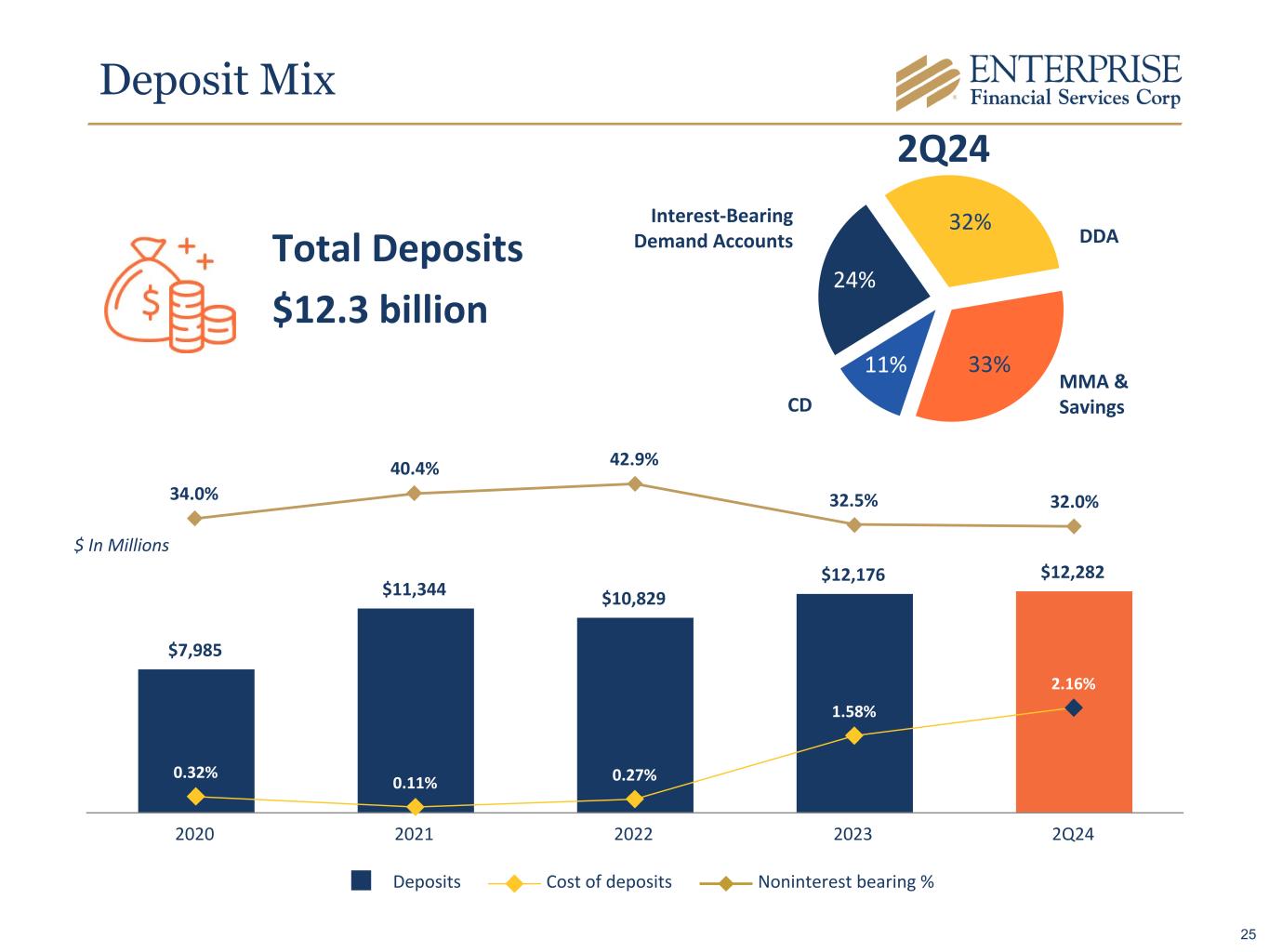 34.0% 40.4% 42.9% 32.5% 32.0% 32% 33%11% 24% $7,985 $11,344 $10,829 $12,176 $12,282 0.32% 0.11% 0.27% 1.58% 2.16% Deposits Cost of deposits Noninterest bearing % 2020 2021 2022 2023 2Q24 CD Interest-Bearing Demand Accounts DDA MMA & Savings $ In Millions Total Deposits $12.3 billion 2Q24 Deposit Mix 25