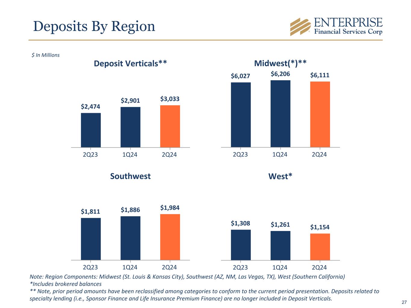 Deposit Details 2Q24 1Q24 2Q23 Qtr Change LTM Change Noninterest-bearing demand accounts $ 3,928 $ 3,805 $ 3,881 $ 123 $ 47 Interest-bearing demand accounts 2,952 2,956 2,629 (4) 323 Money market accounts 3,474 3,431 2,913 43 561 Savings accounts 565 576 665 (11) (100) Certificates of deposit: Brokered 495 659 894 (164) (399) Customer 868 827 638 41 230 Total Deposits $ 12,282 $ 12,254 $ 11,620 $ 28 $ 662 Deposit Verticals (included in total deposits)** $ 3,033 $ 2,901 $ 2,474 $ 132 $ 559 $ In Millions * Total deposits excluding Deposit Verticals and brokered CDs increased $60 million from 1Q24 and increased $502 million from 2Q23 ** Note: prior period amounts have been reclassified among categories to conform to the current period presentation. Deposits related to specialty lending (i.e., Sponsor Finance and Life Insurance Premium Finance) are no longer included in Deposit Verticals. * 26