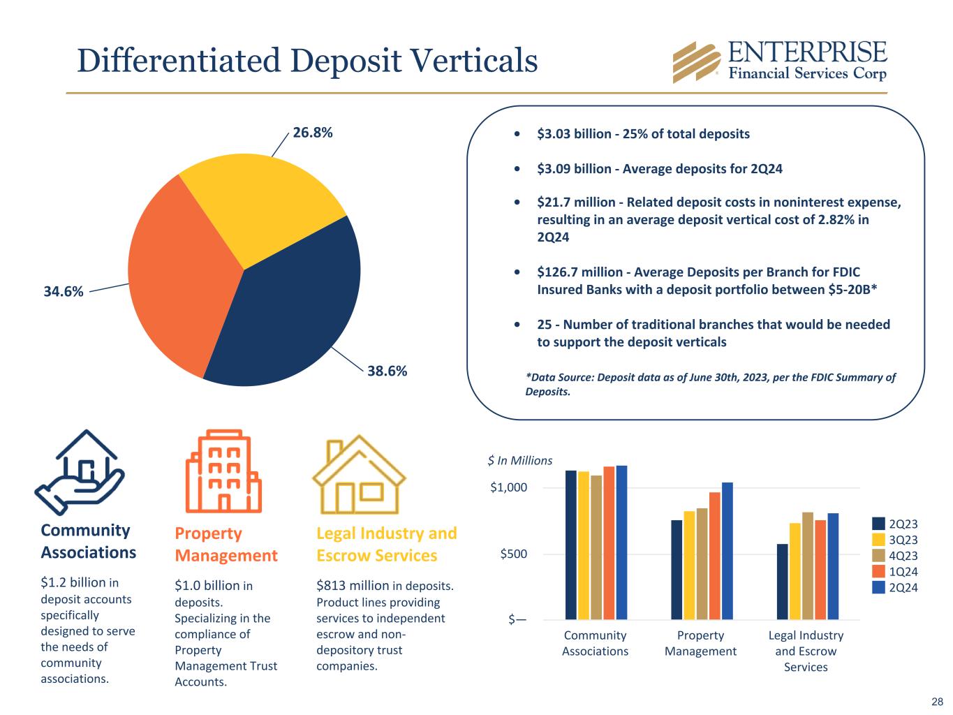 Deposits By Region Deposit Verticals** $2,474 $2,901 $3,033 2Q23 1Q24 2Q24 $ In Millions Midwest(*)** $6,027 $6,206 $6,111 2Q23 1Q24 2Q24 Southwest $1,811 $1,886 $1,984 2Q23 1Q24 2Q24 West* $1,308 $1,261 $1,154 2Q23 1Q24 2Q24 Note: Region Components: Midwest (St. Louis & Kansas City), Southwest (AZ, NM, Las Vegas, TX), West (Southern California) *Includes brokered balances ** Note, prior period amounts have been reclassified among categories to conform to the current period presentation. Deposits related to specialty lending (i.e., Sponsor Finance and Life Insurance Premium Finance) are no longer included in Deposit Verticals. 27