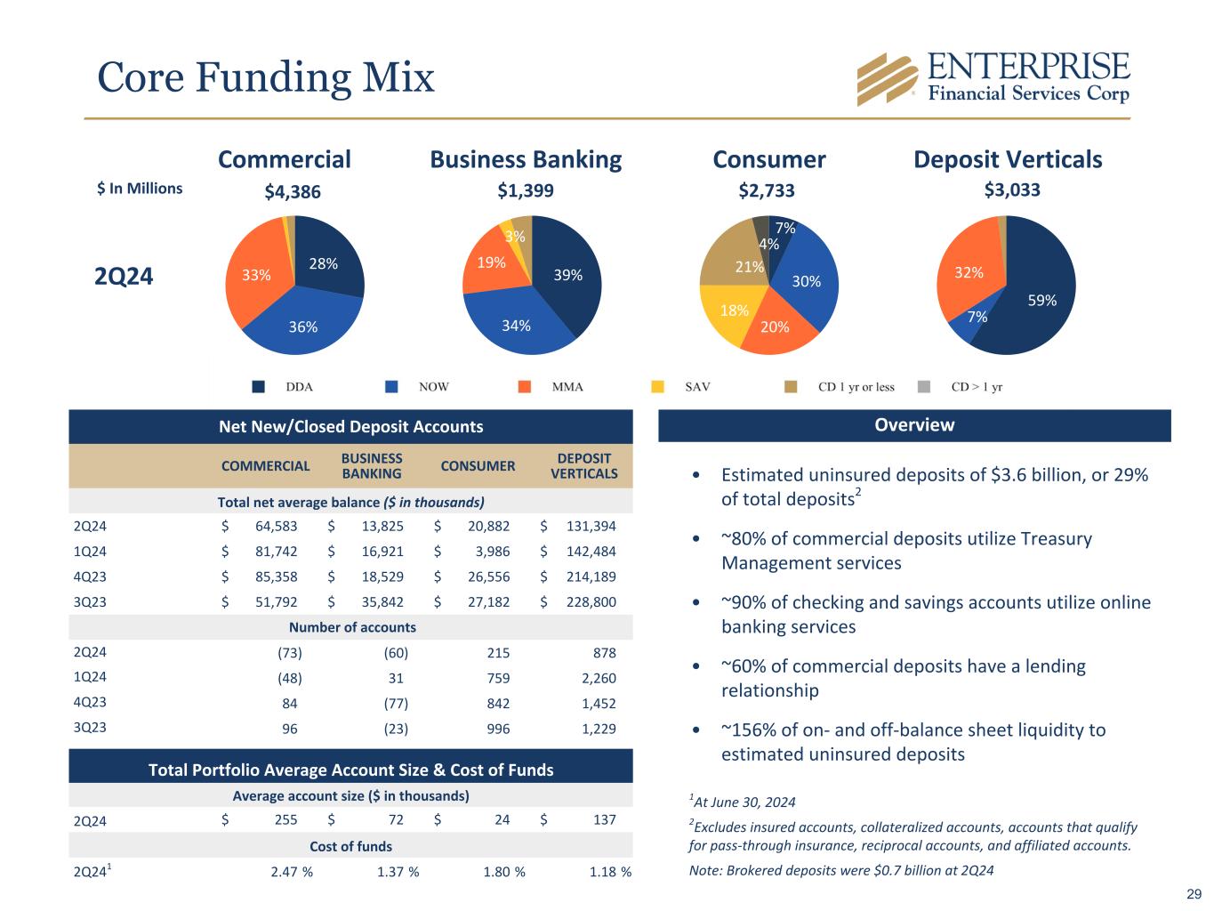 Core Funding Mix Commercial Business Banking Consumer $ In Millions $2,733$1,399$4,386 1At June 30, 2024 2Excludes insured accounts, collateralized accounts, accounts that qualify for pass-through insurance, reciprocal accounts, and affiliated accounts. Note: Brokered deposits were $0.7 billion at 2Q24 Deposit Verticals $3,033 2Q24 Net New/Closed Deposit Accounts COMMERCIAL BUSINESS BANKING CONSUMER DEPOSIT VERTICALS Total net average balance ($ in thousands) 2Q24 $ 64,583 $ 13,825 $ 20,882 $ 131,394 1Q24 $ 81,742 $ 16,921 $ 3,986 $ 142,484 4Q23 $ 85,358 $ 18,529 $ 26,556 $ 214,189 3Q23 $ 51,792 $ 35,842 $ 27,182 $ 228,800 Number of accounts 2Q24 (73) (60) 215 878 1Q24 (48) 31 759 2,260 4Q23 84 (77) 842 1,452 3Q23 96 (23) 996 1,229 Total Portfolio Average Account Size & Cost of Funds Average account size ($ in thousands) 2Q24 $ 255 $ 72 $ 24 $ 137 Cost of funds 2Q241 2.47 % 1.37 % 1.80 % 1.18 % • Estimated uninsured deposits of $3.6 billion, or 29% of total deposits2 • ~80% of commercial deposits utilize Treasury Management services • ~90% of checking and savings accounts utilize online banking services • ~60% of commercial deposits have a lending relationship • ~156% of on- and off-balance sheet liquidity to estimated uninsured deposits Overview 28% 36% 33% 39% 34% 19% 3% 7% 30% 20% 18% 21% 4% 59% 7% 32% 29