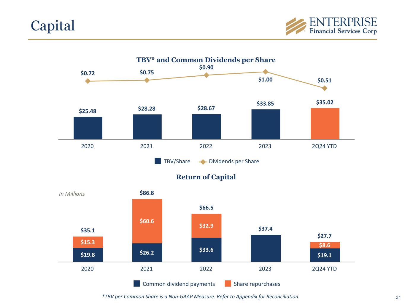Capital Strategy EFSC Capital Strategy: Low Cost - Highly Flexible High Capital Retention Rate Supports Robust Asset Growth Maintain High Quality Capital Stack Maintain 8-9% TCE • Strong earnings profile • Sustainable dividend profile • Organic loan and deposit growth • High quality M&A to enhance commercial franchise and geographic diversification • Minimize WACC over time (preferred, sub debt, etc.) • Optimize capital levels CET1 ~10%, Tier 1 ~12%, and Total Capital ~14% • Common stock repurchases of 225,135 shares at an average price per share of $38.07 • M&A deal structures • Drives ROATCE above peer levels 30