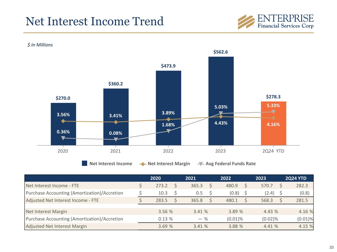 Net Interest Income Trend $ In Millions $270.0 $360.2 $473.9 $562.6 $278.3 3.56% 3.41% 3.89% 4.43% 4.16% 0.36% 0.08% 1.68% 5.03% 5.33% Net Interest Income Net Interest Margin Avg Federal Funds Rate 2020 2021 2022 2023 2Q24 YTD 2020 2021 2022 2023 2Q24 YTD Net Interest Income - FTE $ 273.2 $ 365.3 $ 480.9 $ 570.7 $ 282.3 Purchase Accounting (Amortization)/Accretion $ 10.3 $ 0.5 $ (0.8) $ (2.4) $ (0.8) Adjusted Net Interest Income - FTE $ 283.5 $ 365.8 $ 480.1 $ 568.3 $ 281.5 Net Interest Margin 3.56 % 3.41 % 3.89 % 4.43 % 4.16 % Purchase Accounting (Amortization)/Accretion 0.13 % — % (0.01) % (0.02) % (0.01) % Adjusted Net Interest Margin 3.69 % 3.41 % 3.88 % 4.41 % 4.15 % 33