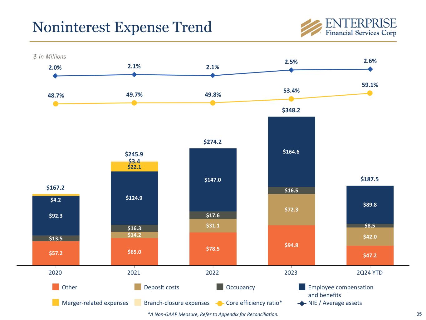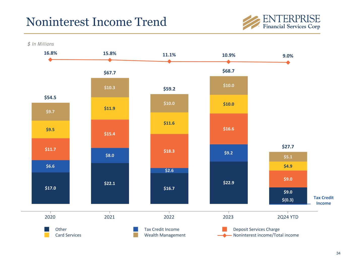 Noninterest Income Trend $ In Millions $54.5 $67.7 $59.2 $68.7 $27.7 $17.0 $22.1 $16.7 $22.9 $9.0 $6.6 $8.0 $2.6 $9.2 $(0.3) $11.7 $15.4 $18.3 $16.6 $9.0 $9.5 $11.9 $11.6 $10.0 $4.9 $9.7 $10.3 $10.0 $10.0 $5.1 16.8% 15.8% 11.1% 10.9% 9.0% Other Tax Credit Income Deposit Services Charge Card Services Wealth Management Noninterest income/Total income 2020 2021 2022 2023 2Q24 YTD Tax Credit Income 34