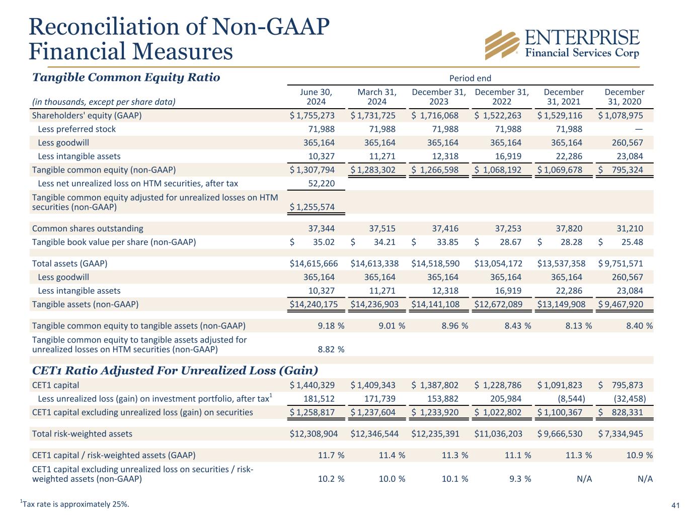 Reconciliation of Non-GAAP Financial Measures Tangible Common Equity Ratio Period end (in thousands, except per share data) June 30, 2024 March 31, 2024 December 31, 2023 December 31, 2022 December 31, 2021 December 31, 2020 Shareholders' equity (GAAP) $ 1,755,273 $ 1,731,725 $ 1,716,068 $ 1,522,263 $ 1,529,116 $ 1,078,975 Less preferred stock 71,988 71,988 71,988 71,988 71,988 — Less goodwill 365,164 365,164 365,164 365,164 365,164 260,567 Less intangible assets 10,327 11,271 12,318 16,919 22,286 23,084 Tangible common equity (non-GAAP) $ 1,307,794 $ 1,283,302 $ 1,266,598 $ 1,068,192 $ 1,069,678 $ 795,324 Less net unrealized loss on HTM securities, after tax 52,220 Tangible common equity adjusted for unrealized losses on HTM securities (non-GAAP) $ 1,255,574 Common shares outstanding 37,344 37,515 37,416 37,253 37,820 31,210 Tangible book value per share (non-GAAP) $ 35.02 $ 34.21 $ 33.85 $ 28.67 $ 28.28 $ 25.48 Total assets (GAAP) $ 14,615,666 $ 14,613,338 $ 14,518,590 $ 13,054,172 $ 13,537,358 $ 9,751,571 Less goodwill 365,164 365,164 365,164 365,164 365,164 260,567 Less intangible assets 10,327 11,271 12,318 16,919 22,286 23,084 Tangible assets (non-GAAP) $ 14,240,175 $ 14,236,903 $ 14,141,108 $ 12,672,089 $ 13,149,908 $ 9,467,920 Tangible common equity to tangible assets (non-GAAP) 9.18 % 9.01 % 8.96 % 8.43 % 8.13 % 8.40 % Tangible common equity to tangible assets adjusted for unrealized losses on HTM securities (non-GAAP) 8.82 % CET1 Ratio Adjusted For Unrealized Loss (Gain) CET1 capital $ 1,440,329 $ 1,409,343 $ 1,387,802 $ 1,228,786 $ 1,091,823 $ 795,873 Less unrealized loss (gain) on investment portfolio, after tax1 181,512 171,739 153,882 205,984 (8,544) (32,458) CET1 capital excluding unrealized loss (gain) on securities $ 1,258,817 $ 1,237,604 $ 1,233,920 $ 1,022,802 $ 1,100,367 $ 828,331 Total risk-weighted assets $ 12,308,904 $ 12,346,544 $ 12,235,391 $ 11,036,203 $ 9,666,530 $ 7,334,945 CET1 capital / risk-weighted assets (GAAP) 11.7 % 11.4 % 11.3 % 11.1 % 11.3 % 10.9 % CET1 capital excluding unrealized loss on securities / risk- weighted assets (non-GAAP) 10.2 % 10.0 % 10.1 % 9.3 % N/A N/A 1Tax rate is approximately 25%. 41