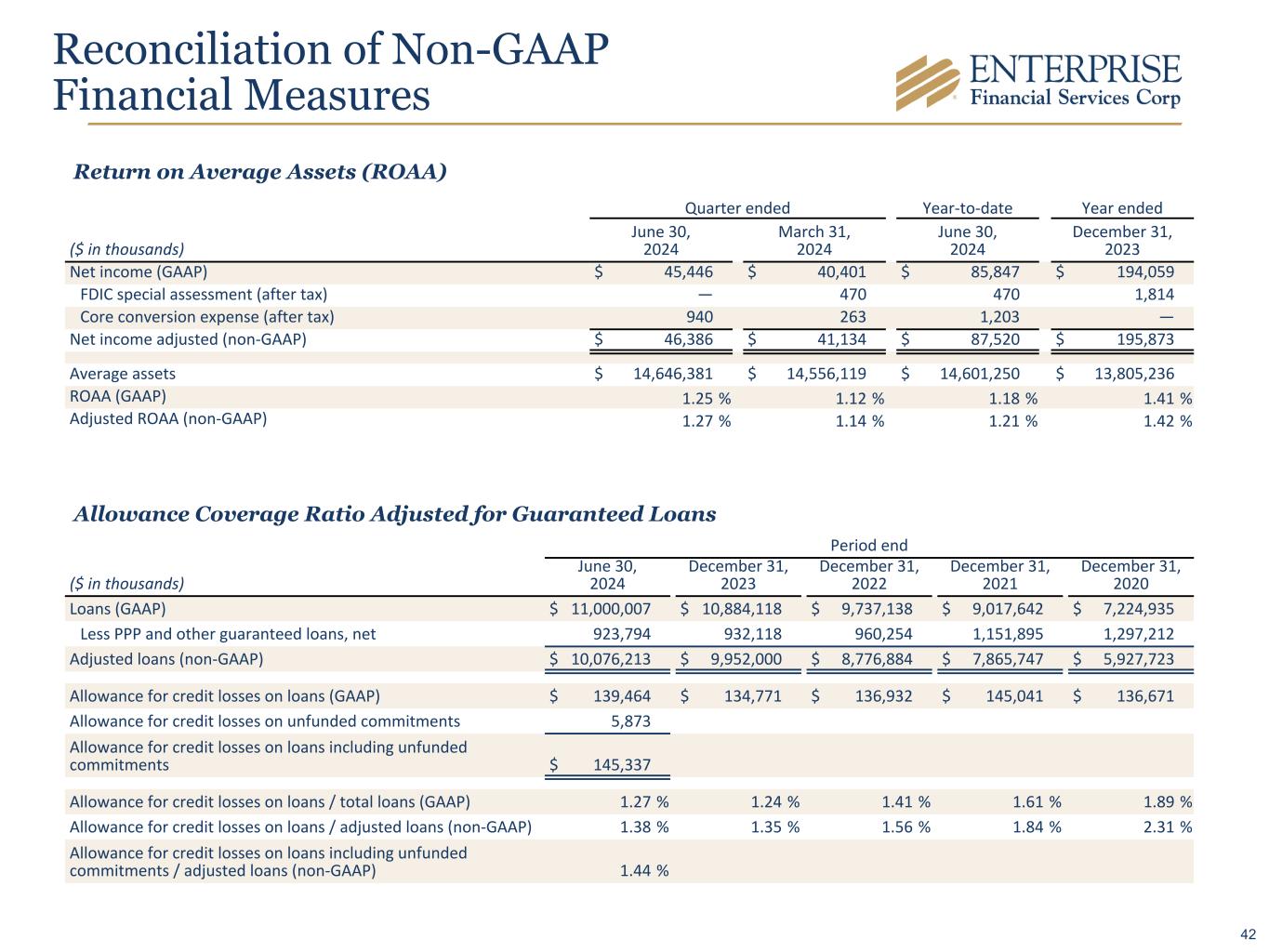 Quarter ended Year-to-date Year ended ($ in thousands) June 30, 2024 March 31, 2024 June 30, 2024 December 31, 2023 Net income (GAAP) $ 45,446 $ 40,401 $ 85,847 $ 194,059 FDIC special assessment (after tax) — 470 470 1,814 Core conversion expense (after tax) 940 263 1,203 — Net income adjusted (non-GAAP) $ 46,386 $ 41,134 $ 87,520 $ 195,873 Average assets $ 14,646,381 $ 14,556,119 $ 14,601,250 $ 13,805,236 ROAA (GAAP) 1.25 % 1.12 % 1.18 % 1.41 % Adjusted ROAA (non-GAAP) 1.27 % 1.14 % 1.21 % 1.42 % Allowance Coverage Ratio Adjusted for Guaranteed Loans Period end ($ in thousands) June 30, 2024 December 31, 2023 December 31, 2022 December 31, 2021 December 31, 2020 Loans (GAAP) $ 11,000,007 $ 10,884,118 $ 9,737,138 $ 9,017,642 $ 7,224,935 Less PPP and other guaranteed loans, net 923,794 932,118 960,254 1,151,895 1,297,212 Adjusted loans (non-GAAP) $ 10,076,213 $ 9,952,000 $ 8,776,884 $ 7,865,747 $ 5,927,723 Allowance for credit losses on loans (GAAP) $ 139,464 $ 134,771 $ 136,932 $ 145,041 $ 136,671 Allowance for credit losses on unfunded commitments 5,873 Allowance for credit losses on loans including unfunded commitments $ 145,337 Allowance for credit losses on loans / total loans (GAAP) 1.27 % 1.24 % 1.41 % 1.61 % 1.89 % Allowance for credit losses on loans / adjusted loans (non-GAAP) 1.38 % 1.35 % 1.56 % 1.84 % 2.31 % Allowance for credit losses on loans including unfunded commitments / adjusted loans (non-GAAP) 1.44 % Reconciliation of Non-GAAP Financial Measures Return on Average Assets (ROAA) 42