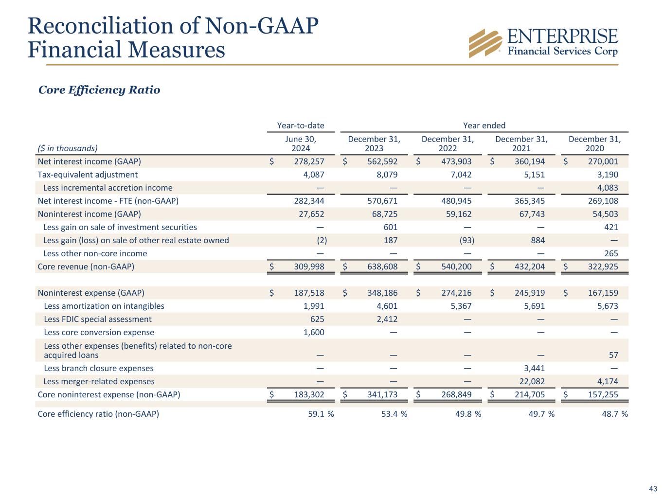 Year-to-date Year ended ($ in thousands) June 30, 2024 December 31, 2023 December 31, 2022 December 31, 2021 December 31, 2020 Net interest income (GAAP) $ 278,257 $ 562,592 $ 473,903 $ 360,194 $ 270,001 Tax-equivalent adjustment 4,087 8,079 7,042 5,151 3,190 Less incremental accretion income — — — — 4,083 Net interest income - FTE (non-GAAP) 282,344 570,671 480,945 365,345 269,108 Noninterest income (GAAP) 27,652 68,725 59,162 67,743 54,503 Less gain on sale of investment securities — 601 — — 421 Less gain (loss) on sale of other real estate owned (2) 187 (93) 884 — Less other non-core income — — — — 265 Core revenue (non-GAAP) $ 309,998 $ 638,608 $ 540,200 $ 432,204 $ 322,925 Noninterest expense (GAAP) $ 187,518 $ 348,186 $ 274,216 $ 245,919 $ 167,159 Less amortization on intangibles 1,991 4,601 5,367 5,691 5,673 Less FDIC special assessment 625 2,412 — — — Less core conversion expense 1,600 — — — — Less other expenses (benefits) related to non-core acquired loans — — — — 57 Less branch closure expenses — — — 3,441 — Less merger-related expenses — — — 22,082 4,174 Core noninterest expense (non-GAAP) $ 183,302 $ 341,173 $ 268,849 $ 214,705 $ 157,255 Core efficiency ratio (non-GAAP) 59.1 % 53.4 % 49.8 % 49.7 % 48.7 % Reconciliation of Non-GAAP Financial Measures Core Efficiency Ratio 43