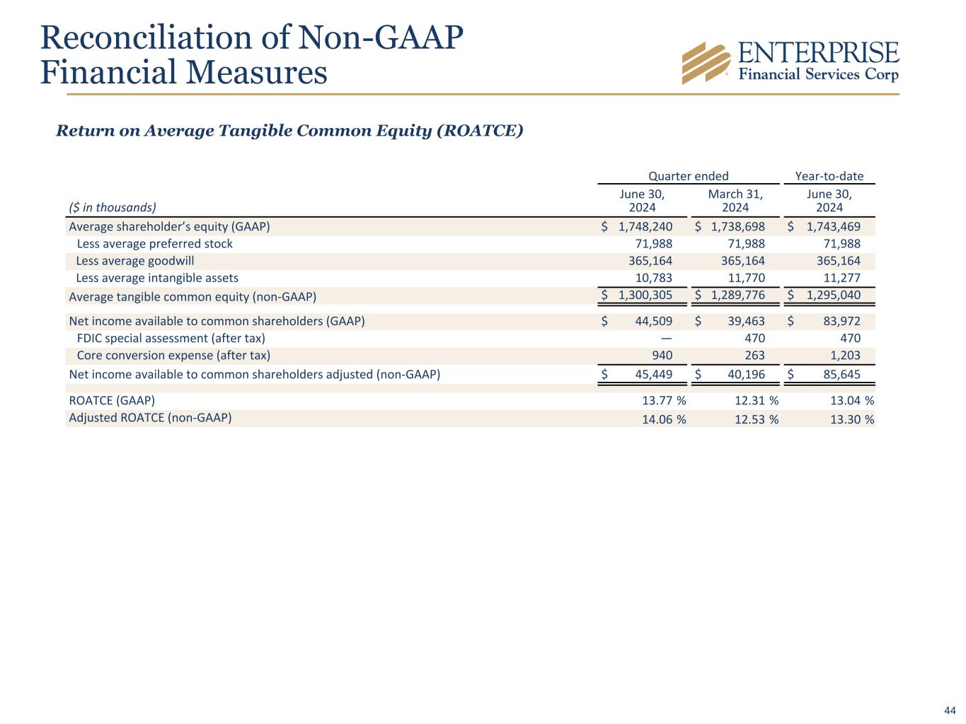 Quarter ended Year-to-date ($ in thousands) June 30, 2024 March 31, 2024 June 30, 2024 Average shareholder’s equity (GAAP) $ 1,748,240 $ 1,738,698 $ 1,743,469 Less average preferred stock 71,988 71,988 71,988 Less average goodwill 365,164 365,164 365,164 Less average intangible assets 10,783 11,770 11,277 Average tangible common equity (non-GAAP) $ 1,300,305 $ 1,289,776 $ 1,295,040 Net income available to common shareholders (GAAP) $ 44,509 $ 39,463 $ 83,972 FDIC special assessment (after tax) — 470 470 Core conversion expense (after tax) 940 263 1,203 Net income available to common shareholders adjusted (non-GAAP) $ 45,449 $ 40,196 $ 85,645 ROATCE (GAAP) 13.77 % 12.31 % 13.04 % Adjusted ROATCE (non-GAAP) 14.06 % 12.53 % 13.30 % Reconciliation of Non-GAAP Financial Measures Return on Average Tangible Common Equity (ROATCE) 44