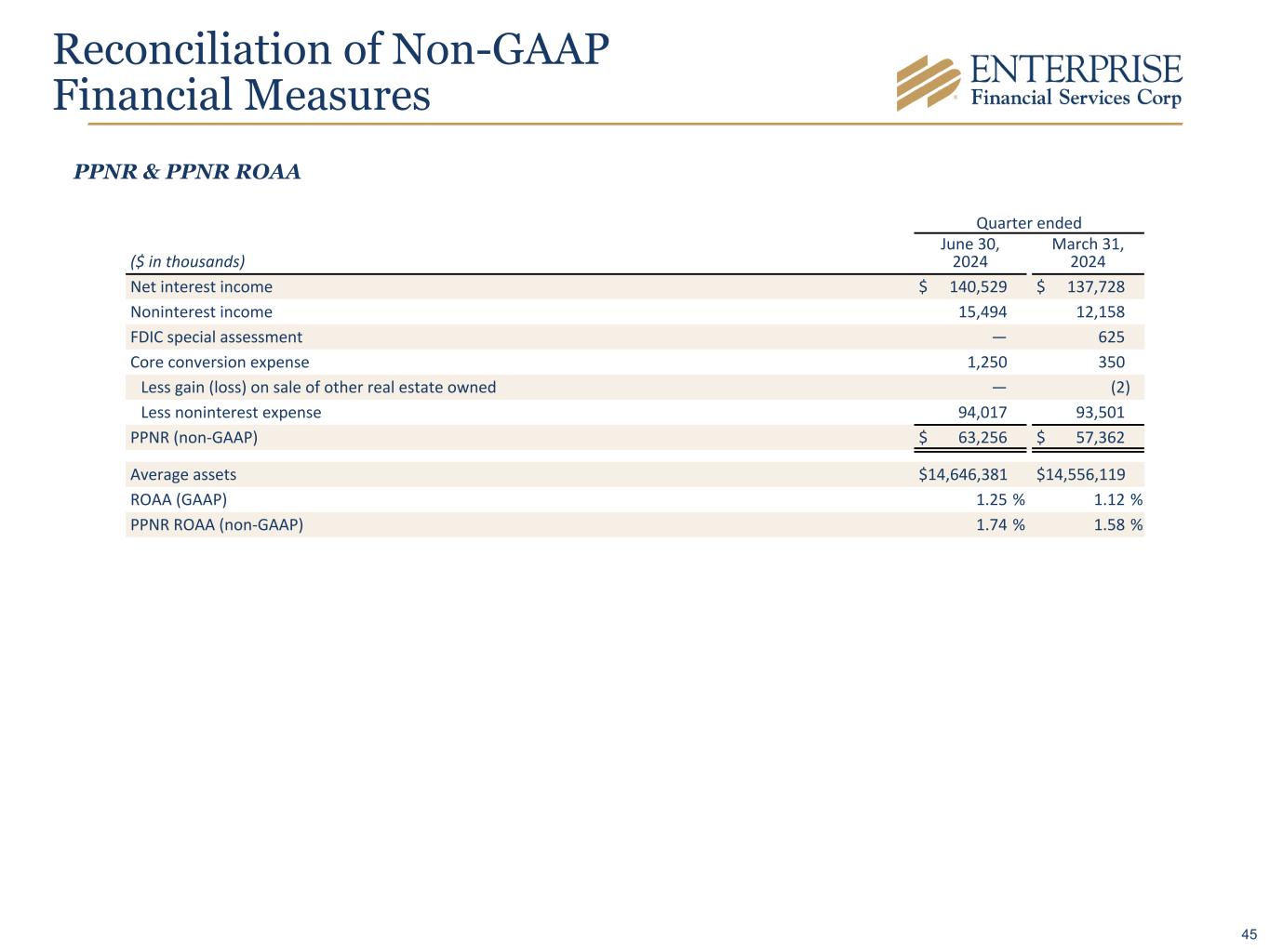 Quarter ended ($ in thousands) June 30, 2024 March 31, 2024 Net interest income $ 140,529 $ 137,728 Noninterest income 15,494 12,158 FDIC special assessment — 625 Core conversion expense 1,250 350 Less gain (loss) on sale of other real estate owned — (2) Less noninterest expense 94,017 93,501 PPNR (non-GAAP) $ 63,256 $ 57,362 Average assets $ 14,646,381 $ 14,556,119 ROAA (GAAP) 1.25 % 1.12 % PPNR ROAA (non-GAAP) 1.74 % 1.58 % PPNR & PPNR ROAA Reconciliation of Non-GAAP Financial Measures 45