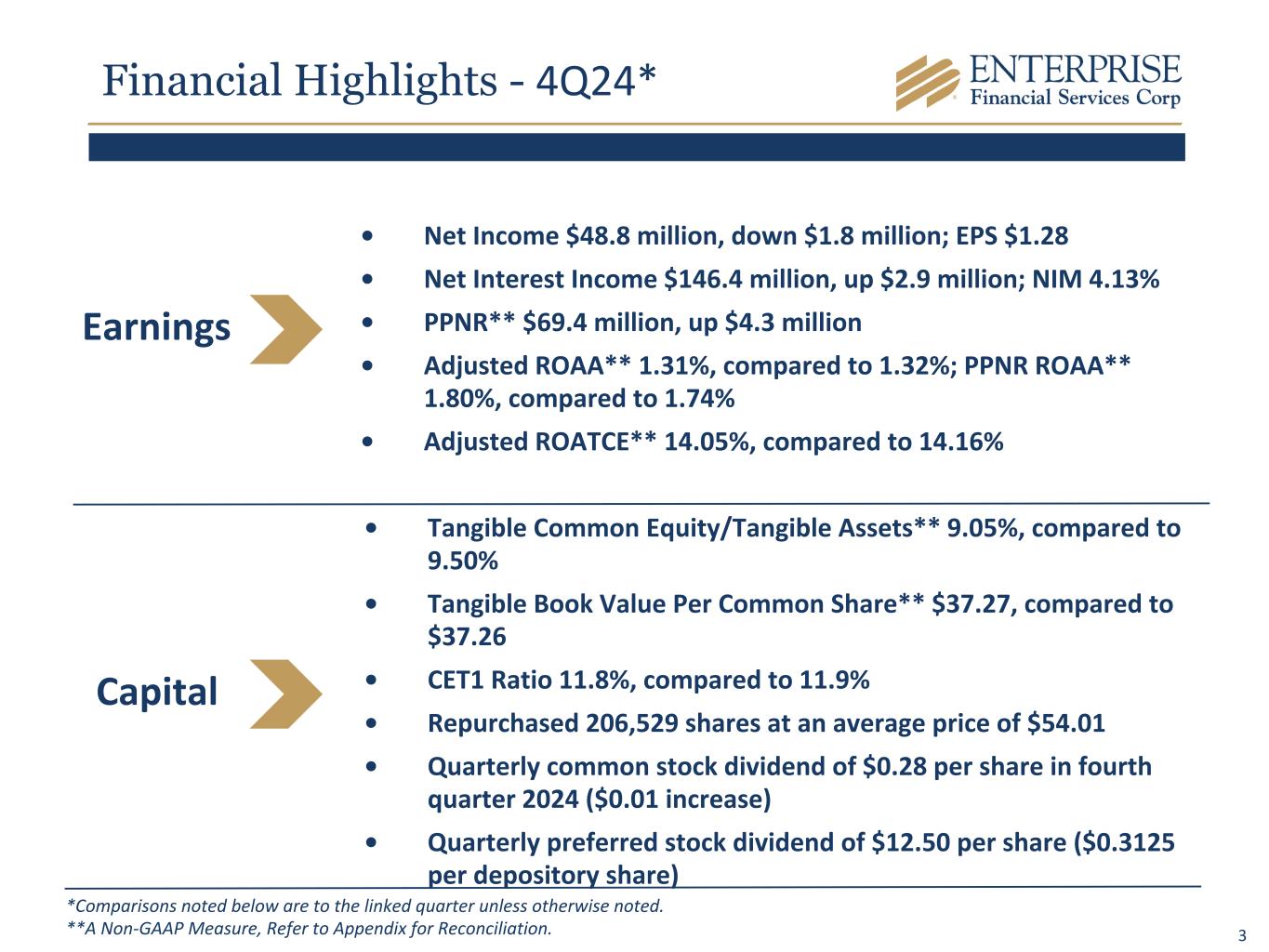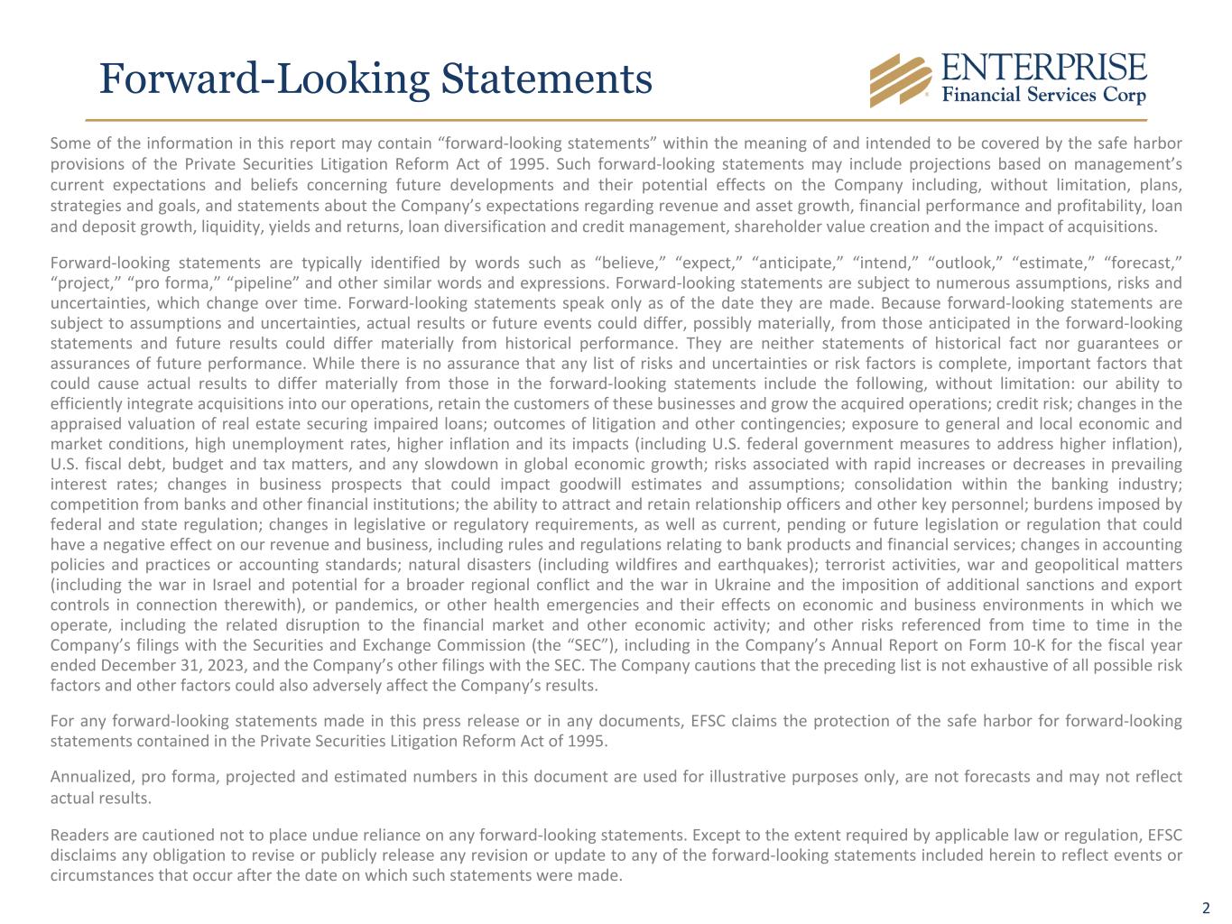 2 Forward-Looking Statements Some of the information in this report may contain “forward-looking statements” within the meaning of and intended to be covered by the safe harbor provisions of the Private Securities Litigation Reform Act of 1995. Such forward-looking statements may include projections based on management’s current expectations and beliefs concerning future developments and their potential effects on the Company including, without limitation, plans, strategies and goals, and statements about the Company’s expectations regarding revenue and asset growth, financial performance and profitability, loan and deposit growth, liquidity, yields and returns, loan diversification and credit management, shareholder value creation and the impact of acquisitions. Forward-looking statements are typically identified by words such as “believe,” “expect,” “anticipate,” “intend,” “outlook,” “estimate,” “forecast,” “project,” “pro forma,” “pipeline” and other similar words and expressions. Forward-looking statements are subject to numerous assumptions, risks and uncertainties, which change over time. Forward-looking statements speak only as of the date they are made. Because forward-looking statements are subject to assumptions and uncertainties, actual results or future events could differ, possibly materially, from those anticipated in the forward-looking statements and future results could differ materially from historical performance. They are neither statements of historical fact nor guarantees or assurances of future performance. While there is no assurance that any list of risks and uncertainties or risk factors is complete, important factors that could cause actual results to differ materially from those in the forward-looking statements include the following, without limitation: our ability to efficiently integrate acquisitions into our operations, retain the customers of these businesses and grow the acquired operations; credit risk; changes in the appraised valuation of real estate securing impaired loans; outcomes of litigation and other contingencies; exposure to general and local economic and market conditions, high unemployment rates, higher inflation and its impacts (including U.S. federal government measures to address higher inflation), U.S. fiscal debt, budget and tax matters, and any slowdown in global economic growth; risks associated with rapid increases or decreases in prevailing interest rates; changes in business prospects that could impact goodwill estimates and assumptions; consolidation within the banking industry; competition from banks and other financial institutions; the ability to attract and retain relationship officers and other key personnel; burdens imposed by federal and state regulation; changes in legislative or regulatory requirements, as well as current, pending or future legislation or regulation that could have a negative effect on our revenue and business, including rules and regulations relating to bank products and financial services; changes in accounting policies and practices or accounting standards; natural disasters (including wildfires and earthquakes); terrorist activities, war and geopolitical matters (including the war in Israel and potential for a broader regional conflict and the war in Ukraine and the imposition of additional sanctions and export controls in connection therewith), or pandemics, or other health emergencies and their effects on economic and business environments in which we operate, including the related disruption to the financial market and other economic activity; and other risks referenced from time to time in the Company’s filings with the Securities and Exchange Commission (the “SEC”), including in the Company’s Annual Report on Form 10-K for the fiscal year ended December 31, 2023, and the Company’s other filings with the SEC. The Company cautions that the preceding list is not exhaustive of all possible risk factors and other factors could also adversely affect the Company’s results. For any forward-looking statements made in this press release or in any documents, EFSC claims the protection of the safe harbor for forward-looking statements contained in the Private Securities Litigation Reform Act of 1995. Annualized, pro forma, projected and estimated numbers in this document are used for illustrative purposes only, are not forecasts and may not reflect actual results. Readers are cautioned not to place undue reliance on any forward-looking statements. Except to the extent required by applicable law or regulation, EFSC disclaims any obligation to revise or publicly release any revision or update to any of the forward-looking statements included herein to reflect events or circumstances that occur after the date on which such statements were made.
