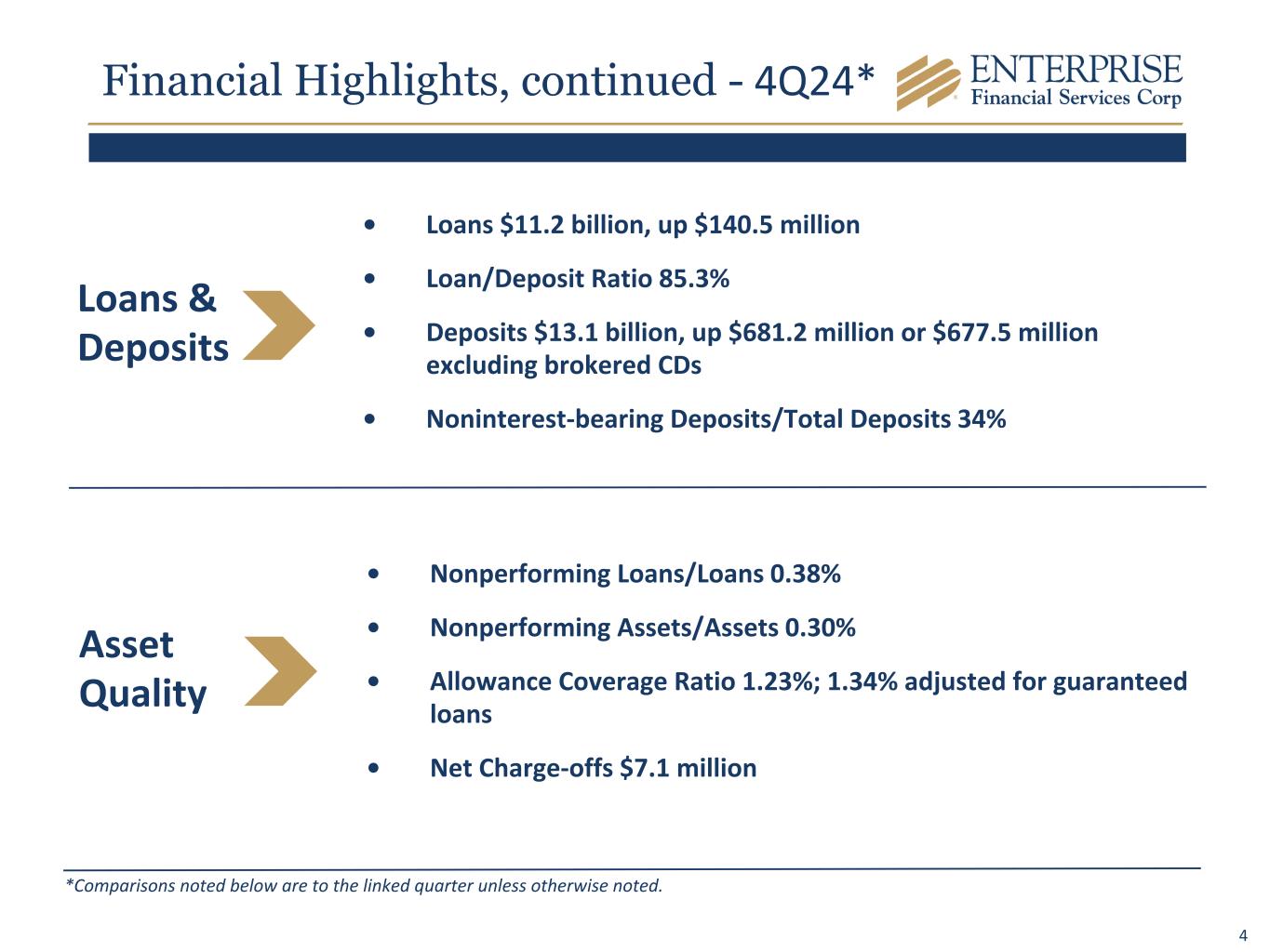 3 *Comparisons noted below are to the linked quarter unless otherwise noted. **A Non-GAAP Measure, Refer to Appendix for Reconciliation. Capital • Tangible Common Equity/Tangible Assets** 9.05%, compared to 9.50% • Tangible Book Value Per Common Share** $37.27, compared to $37.26 • CET1 Ratio 11.8%, compared to 11.9% • Repurchased 206,529 shares at an average price of $54.01 • Quarterly common stock dividend of $0.28 per share in fourth quarter 2024 ($0.01 increase) • Quarterly preferred stock dividend of $12.50 per share ($0.3125 per depository share) • Net Income $48.8 million, down $1.8 million; EPS $1.28 • Net Interest Income $146.4 million, up $2.9 million; NIM 4.13% • PPNR** $69.4 million, up $4.3 million • Adjusted ROAA** 1.31%, compared to 1.32%; PPNR ROAA** 1.80%, compared to 1.74% • Adjusted ROATCE** 14.05%, compared to 14.16% Earnings Financial Highlights - 4Q24*