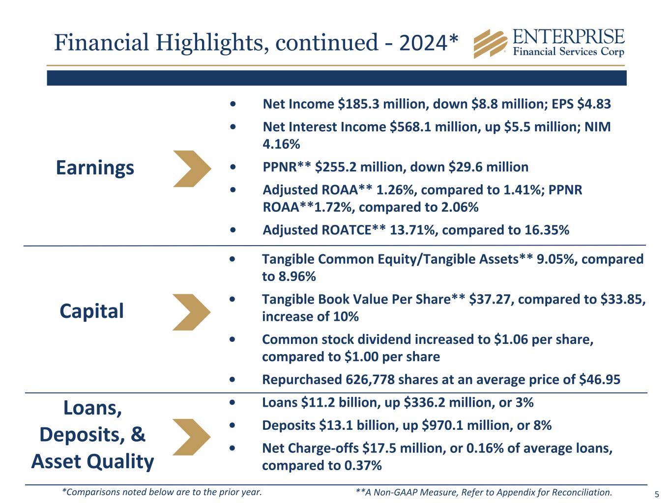 4 *Comparisons noted below are to the linked quarter unless otherwise noted. Loans & Deposits • Loans $11.2 billion, up $140.5 million • Loan/Deposit Ratio 85.3% • Deposits $13.1 billion, up $681.2 million or $677.5 million excluding brokered CDs • Noninterest-bearing Deposits/Total Deposits 34% Asset Quality • Nonperforming Loans/Loans 0.38% • Nonperforming Assets/Assets 0.30% • Allowance Coverage Ratio 1.23%; 1.34% adjusted for guaranteed loans • Net Charge-offs $7.1 million Financial Highlights, continued - 4Q24*