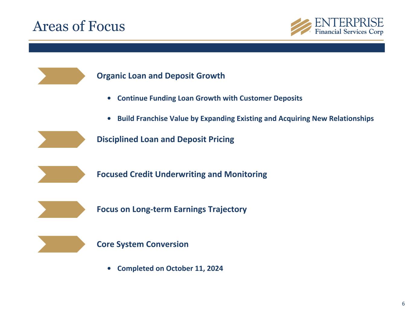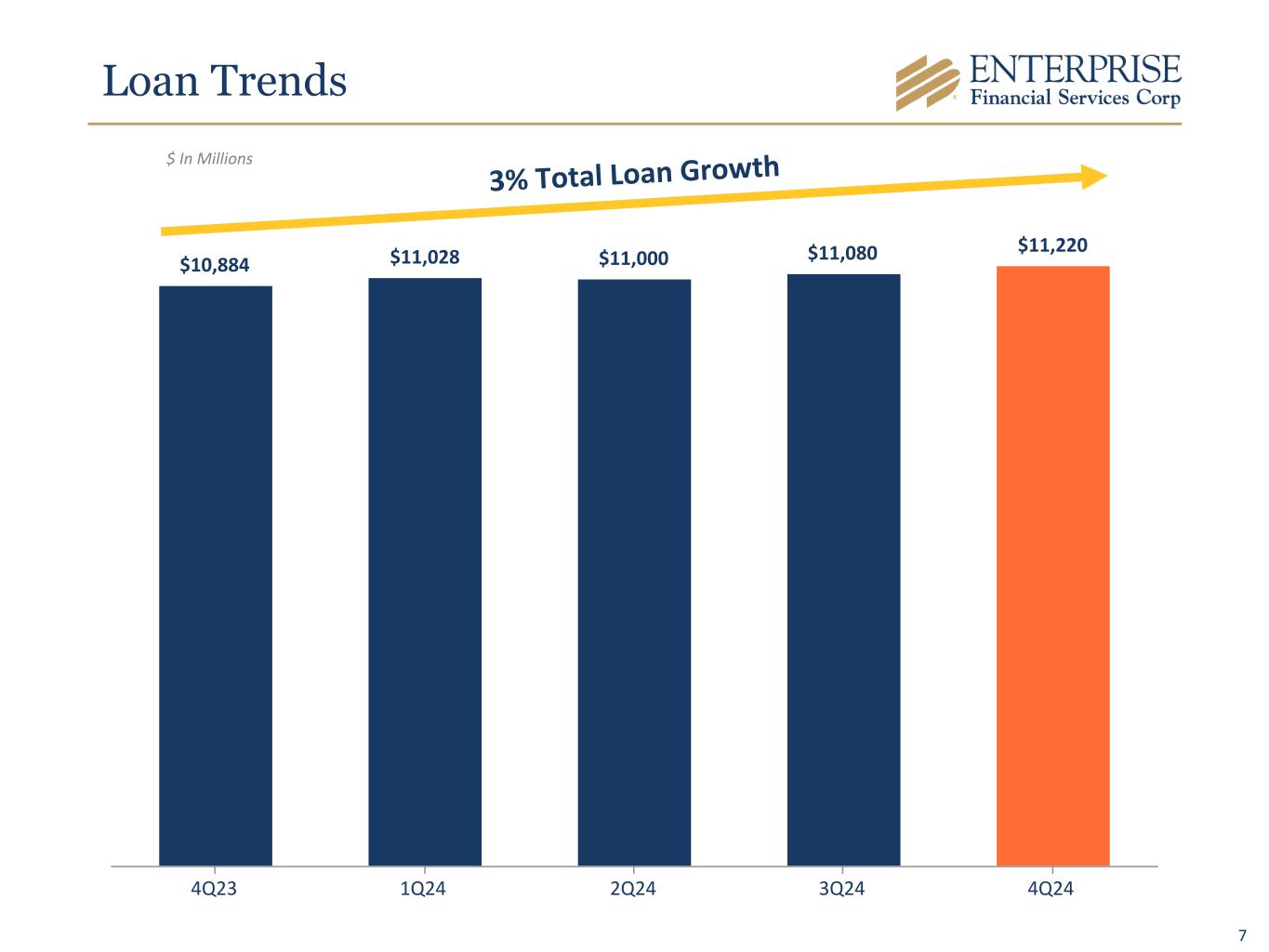 6 Areas of Focus Organic Loan and Deposit Growth • Continue Funding Loan Growth with Customer Deposits • Build Franchise Value by Expanding Existing and Acquiring New Relationships Disciplined Loan and Deposit Pricing Focused Credit Underwriting and Monitoring Focus on Long-term Earnings Trajectory Core System Conversion • Completed on October 11, 2024