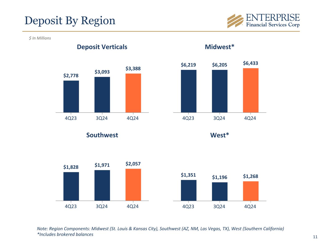10 Deposit Details 4Q24 3Q24 4Q23 Qtr Change LTM Change Noninterest-bearing demand accounts $ 4,484 $ 3,934 $ 3,959 $ 550 $ 525 Interest-bearing demand accounts 3,175 3,049 2,950 126 225 Money market accounts 3,564 3,568 3,399 (4) 165 Savings accounts 553 553 595 — (42) Certificates of deposit: Brokered 485 481 483 4 2 Customer 885 880 790 5 95 Total Deposits $ 13,146 $ 12,465 $ 12,176 $ 681 $ 970 Deposit Verticals (included in total deposits) $ 3,388 $ 3,093 $ 2,778 $ 295 $ 610 $ In Millions * Total deposits excluding Deposit Verticals and brokered CDs increased $382 million from 3Q24 and increased $358 million from 4Q23. **