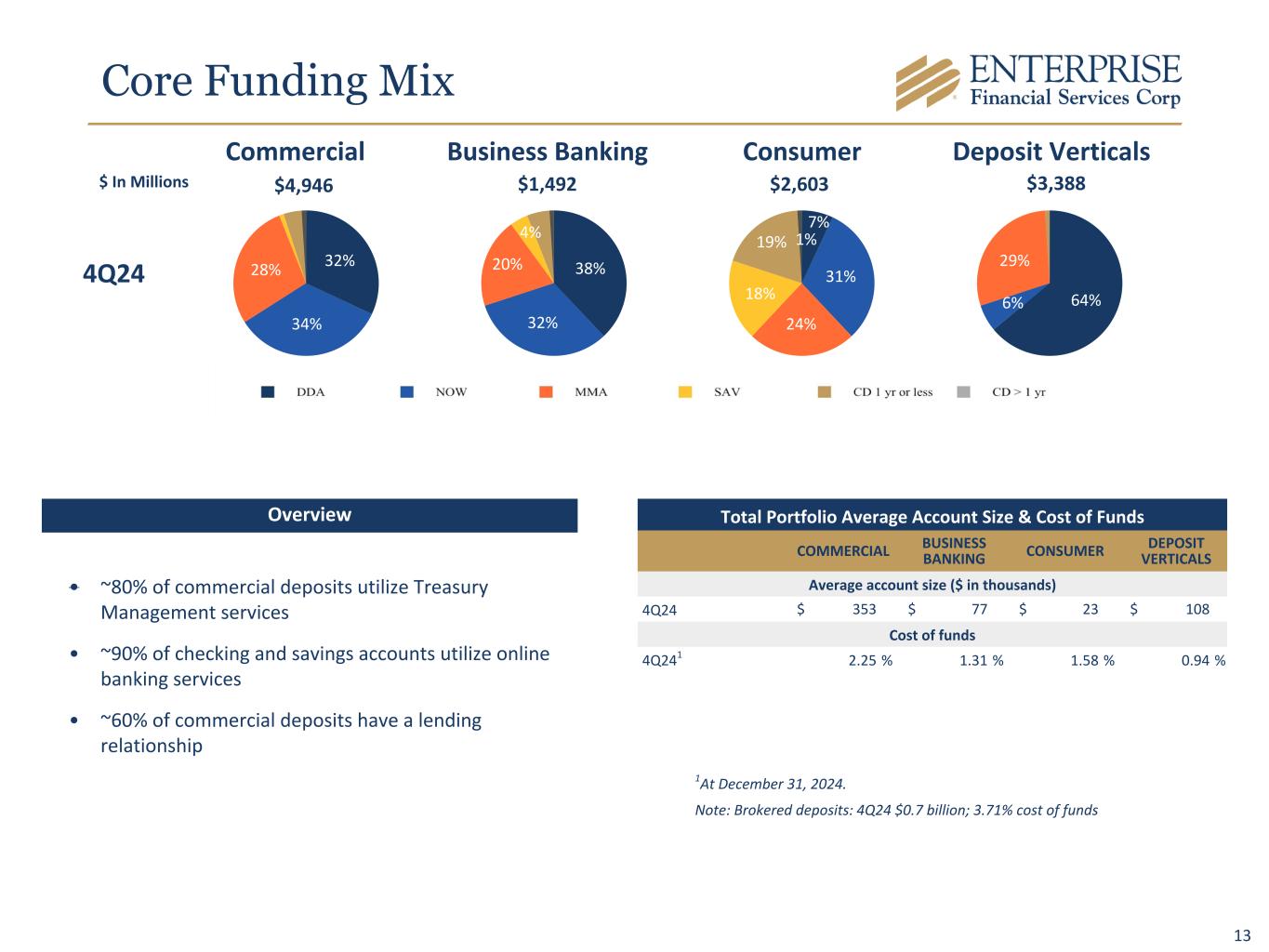 12 Differentiated Deposit Verticals 36.7% 36.1% 27.2% Community Associations $1.2 billion in deposit accounts specifically designed to serve the needs of community associations. Property Management $1.2 billion in deposits. Specializing in the compliance of Property Management Trust Accounts. Legal Industry and Escrow Services $922 million in deposits. Product lines providing services to independent escrow and non- depository trust companies. • $3.39 billion - 26% of total deposits • $3.35 billion - Average deposits for 4Q24 • $22.9 million - Related deposit costs in noninterest expense, resulting in an average deposit vertical cost of 2.72% in 4Q24 • $144.3 million - Average Deposits per Branch for FDIC Insured Banks with a deposit portfolio between $5-20B* ◦ 23 - Number of traditional branches that would support the EFSC deposit vertical portfolio *Data Source: Deposit data as of June 30th, 2024, per the FDIC Summary of Deposits. 4Q23 1Q24 2Q24 3Q24 4Q24 Community Associations Property Management Legal Industry and Escrow Services $— $500 $1,000 $ In Millions