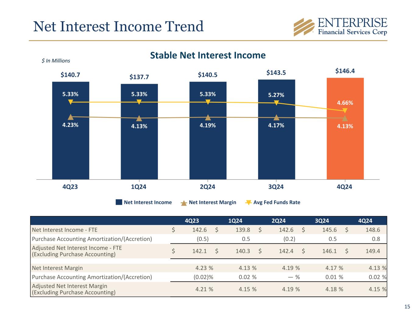 14 Earnings Per Share Trend - 4Q24 $1.32 $0.05 $(0.06) $(0.03) $1.28 3Q24 Operating Revenue Provision for Credit Losses Noninterest Expense 4Q24 Change in Diluted EPS