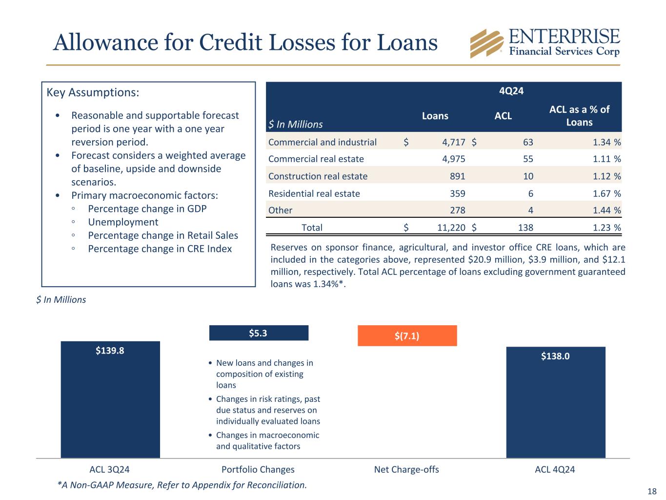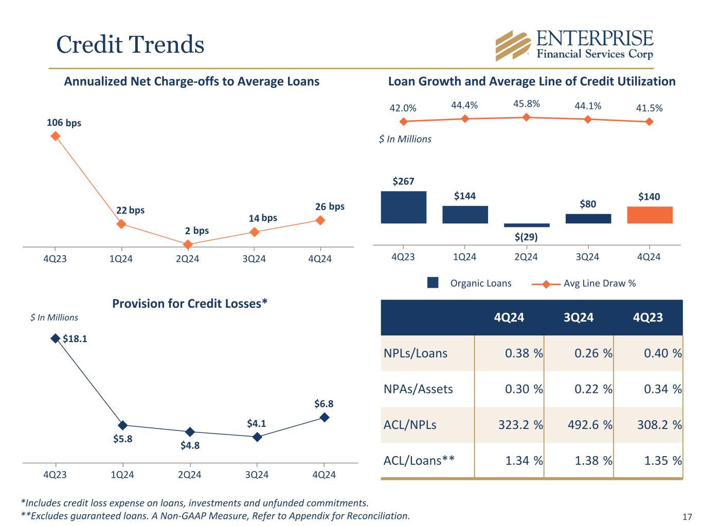 17 106 22 2 14 26 4Q23 1Q24 2Q24 3Q24 4Q24 $267 $144 $(29) $80 $140 42.0% 44.4% 45.8% 44.1% 41.5% Organic Loans Avg Line Draw % 4Q23 1Q24 2Q24 3Q24 4Q24 4Q24 3Q24 4Q23 NPLs/Loans 0.38 % 0.26 % 0.40 % NPAs/Assets 0.30 % 0.22 % 0.34 % ACL/NPLs 323.2 % 492.6 % 308.2 % ACL/Loans** 1.34 % 1.38 % 1.35 % Annualized Net Charge-offs to Average Loans Provision for Credit Losses* $18.1 $5.8 $4.8 $4.1 $6.8 4Q23 1Q24 2Q24 3Q24 4Q24 $ In Millions bps bps bps bps bps $ In Millions Loan Growth and Average Line of Credit Utilization *Includes credit loss expense on loans, investments and unfunded commitments. **Excludes guaranteed loans. A Non-GAAP Measure, Refer to Appendix for Reconciliation. Credit Trends