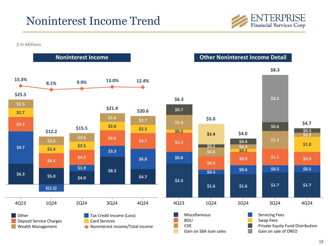 18 $139.8 $5.3 $(7.1) $138.0 ACL 3Q24 Portfolio Changes Net Charge-offs ACL 4Q24 Allowance for Credit Losses for Loans $ In Millions • New loans and changes in composition of existing loans • Changes in risk ratings, past due status and reserves on individually evaluated loans • Changes in macroeconomic and qualitative factors 4Q24 $ In Millions Loans ACL ACL as a % of Loans Commercial and industrial $ 4,717 $ 63 1.34 % Commercial real estate 4,975 55 1.11 % Construction real estate 891 10 1.12 % Residential real estate 359 6 1.67 % Other 278 4 1.44 % Total $ 11,220 $ 138 1.23 % Reserves on sponsor finance, agricultural, and investor office CRE loans, which are included in the categories above, represented $20.9 million, $3.9 million, and $12.1 million, respectively. Total ACL percentage of loans excluding government guaranteed loans was 1.34%*. Key Assumptions: • Reasonable and supportable forecast period is one year with a one year reversion period. • Forecast considers a weighted average of baseline, upside and downside scenarios. • Primary macroeconomic factors: ◦ Percentage change in GDP ◦ Unemployment ◦ Percentage change in Retail Sales ◦ Percentage change in CRE Index *A Non-GAAP Measure, Refer to Appendix for Reconciliation.