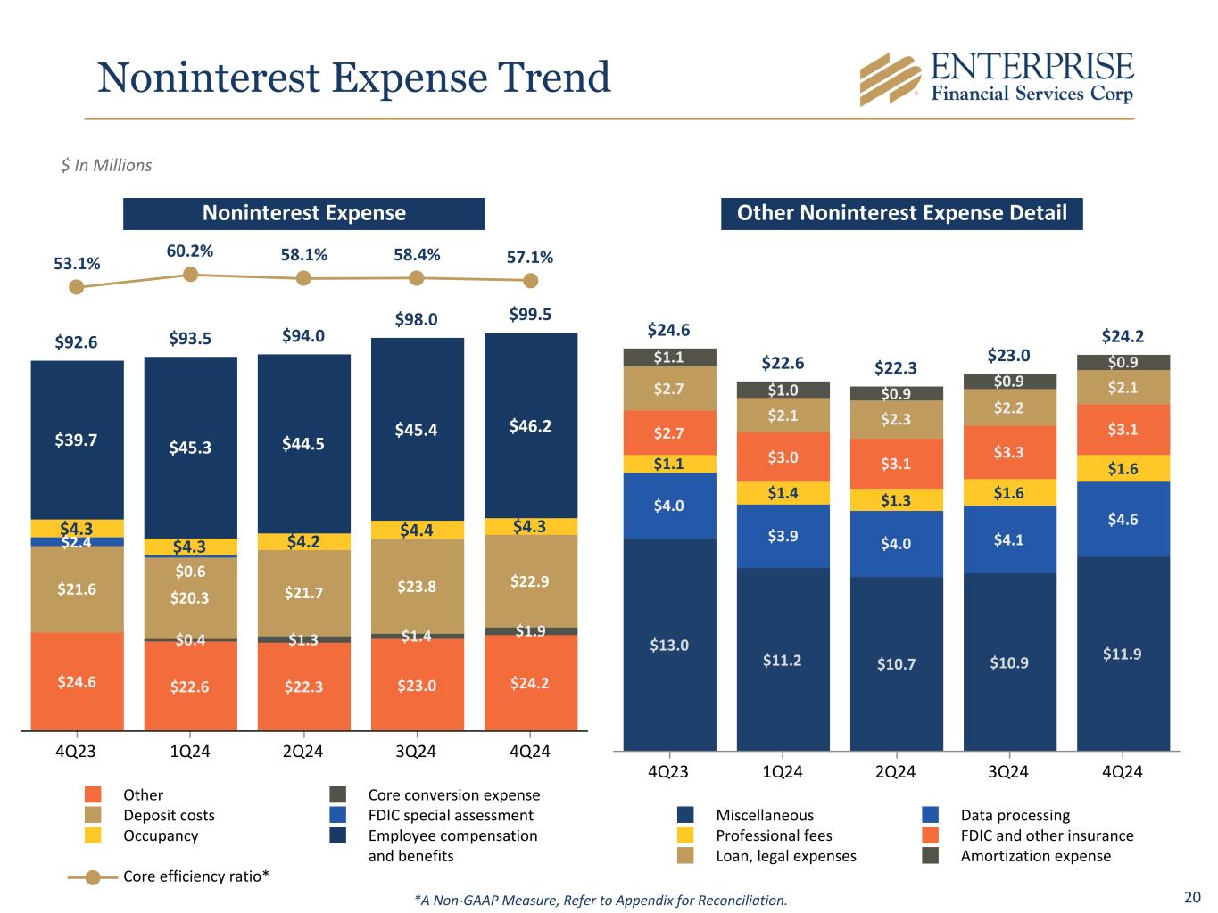 19 Noninterest Income Trend $25.5 $12.2 $15.5 $21.4 $20.6 $6.3 $5.0 $4.0 $8.3 $4.7 $9.7 $(2.2) $1.9 $3.3 $6.0 $4.3 $4.4 $4.5 $4.6 $4.7 $2.7 $2.4 $2.5 $2.6 $2.5 $2.5 $2.6 $2.6 $2.6 $2.7 15.3% 8.1% 9.9% 13.0% 12.4% Other Tax Credit Income (Loss) Deposit Service Charges Card Services Wealth Management Noninterest income/Total income 4Q23 1Q24 2Q24 3Q24 4Q24 $6.3 $5.0 $4.0 $8.3 $4.7 $2.3 $1.6 $1.6 $1.7 $1.7 $0.8 $0.3 $0.6 $0.5 $0.5 $1.3 $0.9 $0.9 $1.1 $0.9 $0.2 $0.2 $1.0 $1.0 $0.6 $0.3 $1.2 $0.3 $0.7 $0.2 $0.4 $0.6 $0.3 $1.4 $3.2 Miscellaneous Servicing Fees BOLI Swap Fees CDE Private Equity Fund Distribution Gain on SBA loan sales Gain on sale of OREO 4Q23 1Q24 2Q24 3Q24 4Q24 $ In Millions Noninterest Income Other Noninterest Income Detail