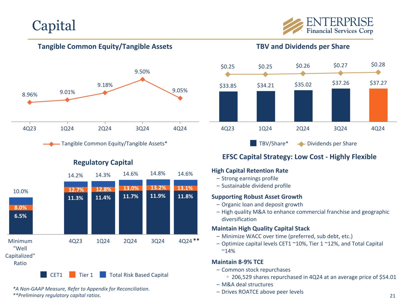 20 Noninterest Expense Trend Other Noninterest Expense DetailNoninterest Expense $ In Millions $92.6 $93.5 $94.0 $98.0 $99.5 $24.6 $22.6 $22.3 $23.0 $24.2 $0.4 $1.3 $1.4 $1.9 $21.6 $20.3 $21.7 $23.8 $22.9 $2.4 $0.6 $4.3 $4.3 $4.2 $4.4 $4.3 $39.7 $45.3 $44.5 $45.4 $46.2 53.1% 60.2% 58.1% 58.4% 57.1% Other Core conversion expense Deposit costs FDIC special assessment Occupancy Employee compensation and benefits Core efficiency ratio* 4Q23 1Q24 2Q24 3Q24 4Q24 $24.6 $22.6 $22.3 $23.0 $24.2 $13.0 $11.2 $10.7 $10.9 $11.9 $4.0 $3.9 $4.0 $4.1 $4.6 $1.1 $1.4 $1.3 $1.6 $1.6 $2.7 $3.0 $3.1 $3.3 $3.1 $2.7 $2.1 $2.3 $2.2 $2.1 $1.1 $1.0 $0.9 $0.9 $0.9 Miscellaneous Data processing Professional fees FDIC and other insurance Loan, legal expenses Amortization expense 4Q23 1Q24 2Q24 3Q24 4Q24 *A Non-GAAP Measure, Refer to Appendix for Reconciliation.