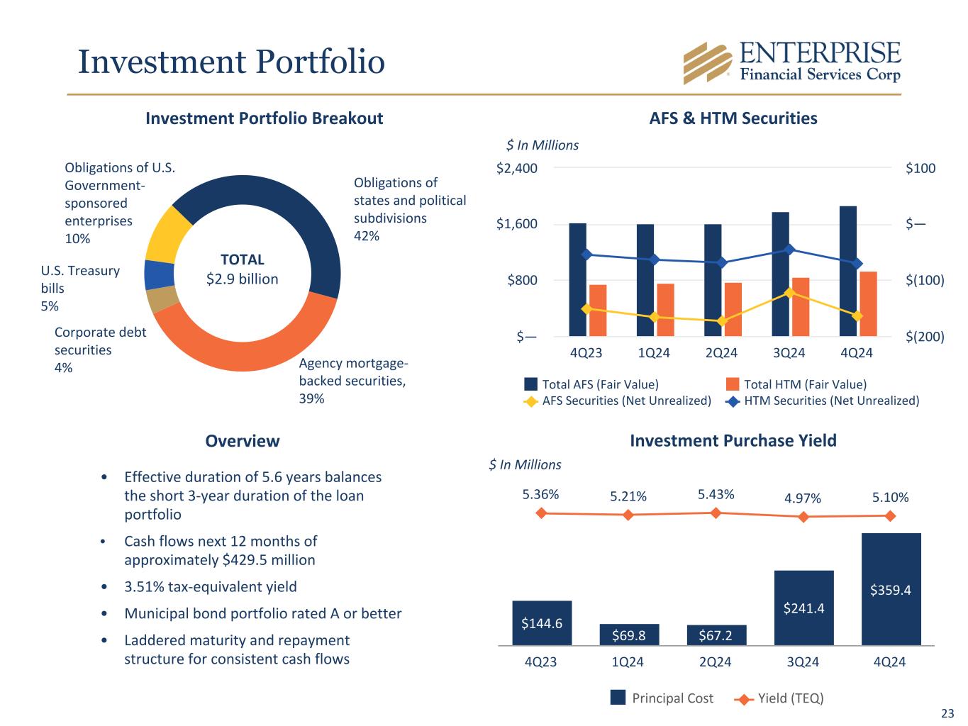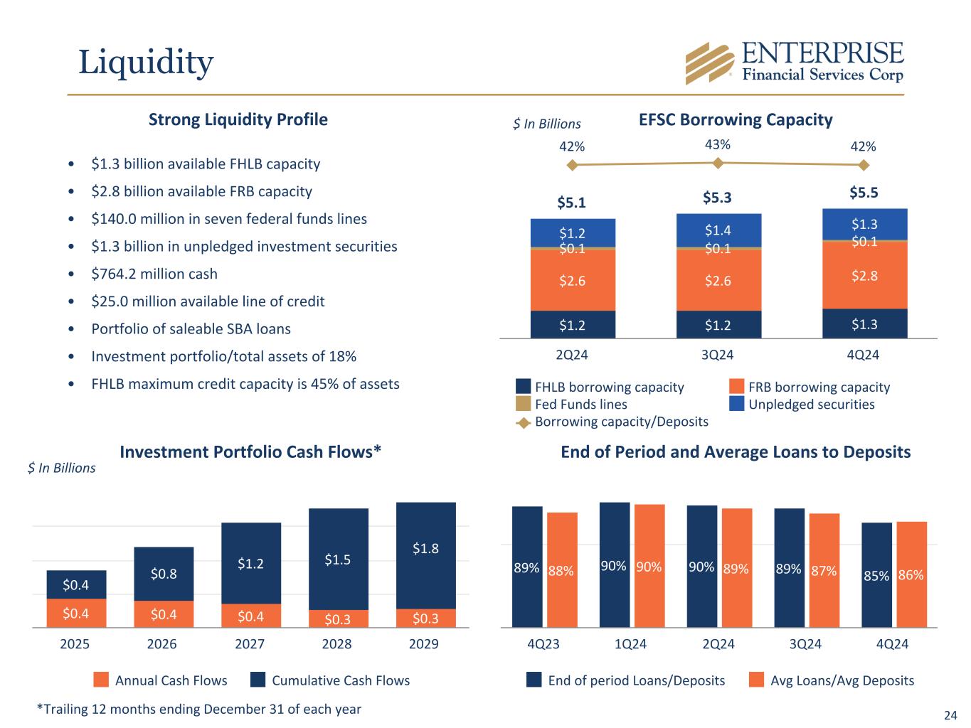 24 EFSC Borrowing Capacity $5.1 $5.3 $5.5 $1.2 $1.2 $1.3 $2.6 $2.6 $2.8 $0.1 $0.1 $0.1$1.2 $1.4 $1.3 42% 43% 42% FHLB borrowing capacity FRB borrowing capacity Fed Funds lines Unpledged securities Borrowing capacity/Deposits 2Q24 3Q24 4Q24 $ In Billions End of Period and Average Loans to Deposits 89% 90% 90% 89% 85%88% 90% 89% 87% 86% End of period Loans/Deposits Avg Loans/Avg Deposits 4Q23 1Q24 2Q24 3Q24 4Q24 • $1.3 billion available FHLB capacity • $2.8 billion available FRB capacity • $140.0 million in seven federal funds lines • $1.3 billion in unpledged investment securities • $764.2 million cash • $25.0 million available line of credit • Portfolio of saleable SBA loans • Investment portfolio/total assets of 18% • FHLB maximum credit capacity is 45% of assets $0.4 $0.4 $0.4 $0.3 $0.3 $0.4 $0.8 $1.2 $1.5 $1.8 Annual Cash Flows Cumulative Cash Flows 2025 2026 2027 2028 2029 Investment Portfolio Cash Flows* $ In Billions Strong Liquidity Profile *Trailing 12 months ending December 31 of each year Liquidity