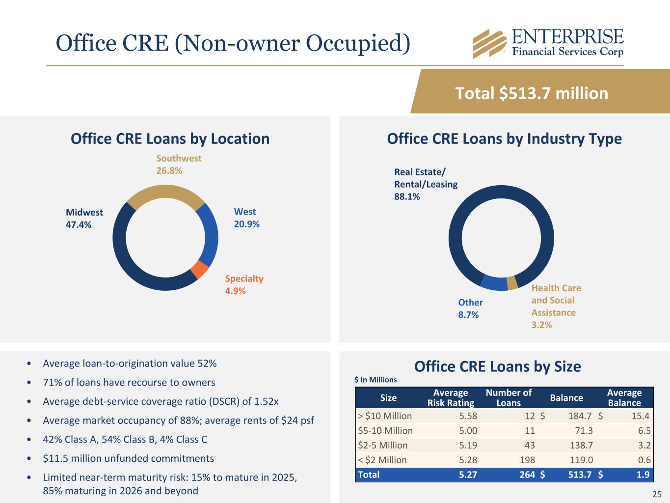 25 Office CRE (Non-owner Occupied) Total $513.7 million Midwest 47.4% Southwest 26.8% West 20.9% Specialty 4.9% Office CRE Loans by Location Real Estate/ Rental/Leasing 88.1% Health Care and Social Assistance 3.2% Other 8.7% Office CRE Loans by Industry Type Size Average Risk Rating Number of Loans Balance Average Balance > $10 Million 5.58 12 $ 184.7 $ 15.4 $5-10 Million 5.00 11 71.3 6.5 $2-5 Million 5.19 43 138.7 3.2 < $2 Million 5.28 198 119.0 0.6 Total 5.27 264 $ 513.7 $ 1.9 Office CRE Loans by Size $ In Millions • Average loan-to-origination value 52% • 71% of loans have recourse to owners • Average debt-service coverage ratio (DSCR) of 1.52x • Average market occupancy of 88%; average rents of $24 psf • 42% Class A, 54% Class B, 4% Class C • $11.5 million unfunded commitments • Limited near-term maturity risk: 15% to mature in 2025, 85% maturing in 2026 and beyond