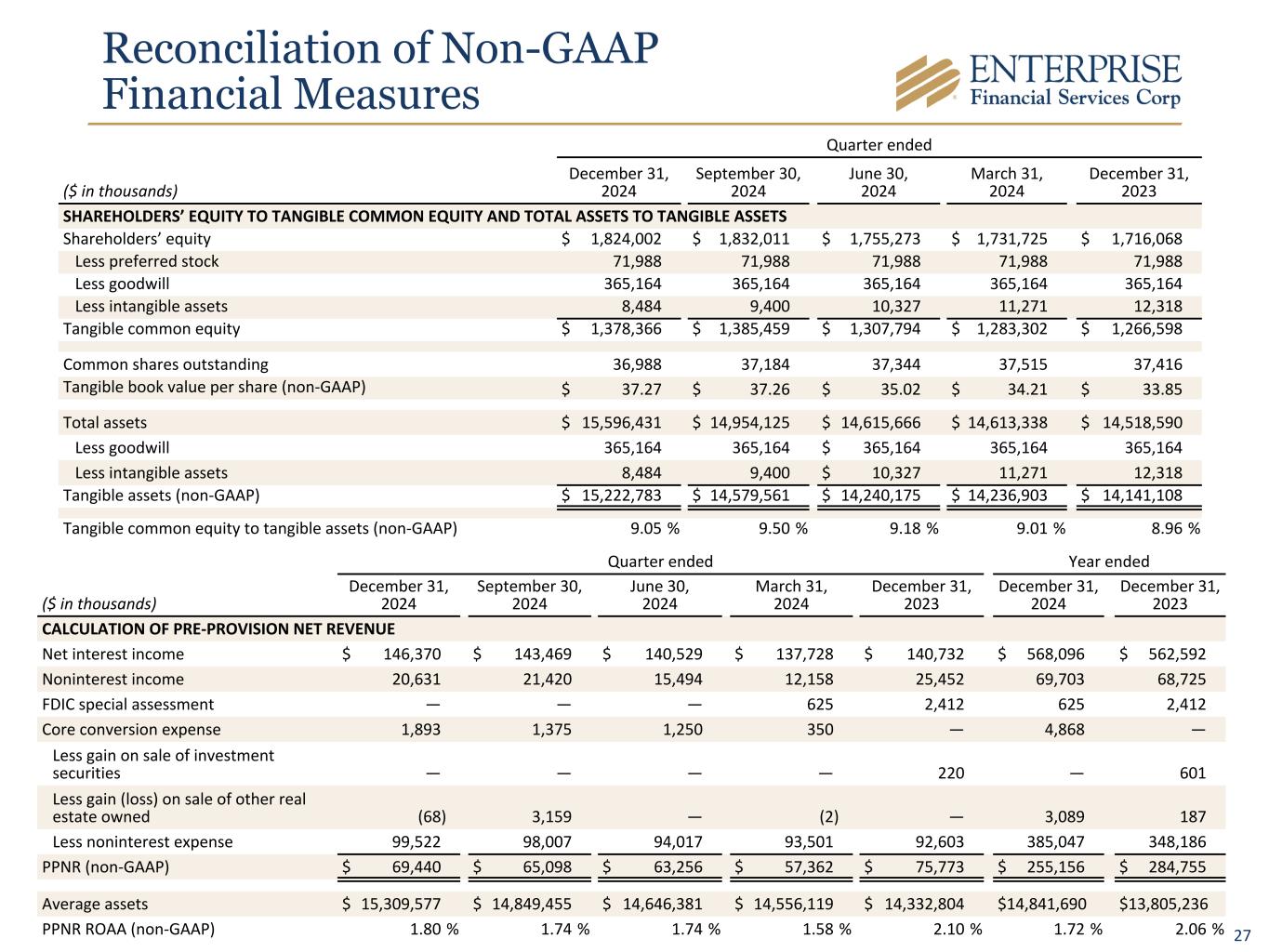 26 Use of Non-GAAP Financial Measures The Company’s accounting and reporting policies conform to generally accepted accounting principles in the United States (“GAAP”) and the prevailing practices in the banking industry. However, the Company provides other financial measures, such as tangible common equity, PPNR, ROATCE, ROAA, PPNR return on average assets (“PPNR ROAA”), core efficiency ratio, the tangible common equity ratio, and tangible book value per common share, in this release that are considered “non-GAAP financial measures.” Generally, a non-GAAP financial measure is a numerical measure of a company’s financial performance, financial position, or cash flows that exclude (or include) amounts that are included in (or excluded from) the most directly comparable measure calculated and presented in accordance with GAAP. The Company considers its tangible common equity, PPNR, ROATCE, ROAA, PPNR ROAA, core efficiency ratio, the tangible common equity ratio, and tangible book value per common share, collectively “core performance measures,” presented in this earnings release and the included tables as important measures of financial performance, even though they are non-GAAP measures, as they provide supplemental information by which to evaluate the impact of certain non-comparable items, and the Company’s operating performance on an ongoing basis. Core performance measures exclude certain other income and expense items, such as the FDIC special assessment, merger-related expenses, facilities charges, and the gain or loss on sale of investment securities, that the Company believes to be not indicative of or useful to measure the Company’s operating performance on an ongoing basis. The attached tables contain a reconciliation of these core performance measures to the GAAP measures. The Company believes that the tangible common equity ratio provides useful information to investors about the Company’s capital strength even though it is considered to be a non-GAAP financial measure and is not part of the regulatory capital requirements to which the Company is subject. The Company believes these non-GAAP measures and ratios, when taken together with the corresponding GAAP measures and ratios, provide meaningful supplemental information regarding the Company’s performance and capital strength. The Company’s management uses, and believes that investors benefit from referring to, these non-GAAP measures and ratios in assessing the Company’s operating results and related trends and when forecasting future periods. However, these non-GAAP measures and ratios should be considered in addition to, and not as a substitute for or preferable to, ratios prepared in accordance with GAAP. In the attached tables, the Company has provided a reconciliation of, where applicable, the most comparable GAAP financial measures and ratios to the non-GAAP financial measures and ratios, or a reconciliation of the non-GAAP calculation of the financial measures for the periods indicated.