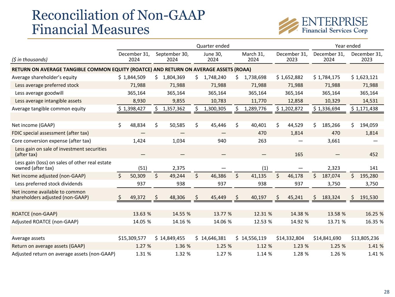 27 Reconciliation of Non-GAAP Financial Measures Quarter ended ($ in thousands) December 31, 2024 September 30, 2024 June 30, 2024 March 31, 2024 December 31, 2023 SHAREHOLDERS’ EQUITY TO TANGIBLE COMMON EQUITY AND TOTAL ASSETS TO TANGIBLE ASSETS Shareholders’ equity $ 1,824,002 $ 1,832,011 $ 1,755,273 $ 1,731,725 $ 1,716,068 Less preferred stock 71,988 71,988 71,988 71,988 71,988 Less goodwill 365,164 365,164 365,164 365,164 365,164 Less intangible assets 8,484 9,400 10,327 11,271 12,318 Tangible common equity $ 1,378,366 $ 1,385,459 $ 1,307,794 $ 1,283,302 $ 1,266,598 Common shares outstanding 36,988 37,184 37,344 37,515 37,416 Tangible book value per share (non-GAAP) $ 37.27 $ 37.26 $ 35.02 $ 34.21 $ 33.85 Total assets $ 15,596,431 $ 14,954,125 $ 14,615,666 $ 14,613,338 $ 14,518,590 Less goodwill 365,164 365,164 $ 365,164 365,164 365,164 Less intangible assets 8,484 9,400 $ 10,327 11,271 12,318 Tangible assets (non-GAAP) $ 15,222,783 $ 14,579,561 $ 14,240,175 $ 14,236,903 $ 14,141,108 Tangible common equity to tangible assets (non-GAAP) 9.05 % 9.50 % 9.18 % 9.01 % 8.96 % Quarter ended Year ended ($ in thousands) December 31, 2024 September 30, 2024 June 30, 2024 March 31, 2024 December 31, 2023 December 31, 2024 December 31, 2023 CALCULATION OF PRE-PROVISION NET REVENUE Net interest income $ 146,370 $ 143,469 $ 140,529 $ 137,728 $ 140,732 $ 568,096 $ 562,592 Noninterest income 20,631 21,420 15,494 12,158 25,452 69,703 68,725 FDIC special assessment — — — 625 2,412 625 2,412 Core conversion expense 1,893 1,375 1,250 350 — 4,868 — Less gain on sale of investment securities — — — — 220 — 601 Less gain (loss) on sale of other real estate owned (68) 3,159 — (2) — 3,089 187 Less noninterest expense 99,522 98,007 94,017 93,501 92,603 385,047 348,186 PPNR (non-GAAP) $ 69,440 $ 65,098 $ 63,256 $ 57,362 $ 75,773 $ 255,156 $ 284,755 Average assets $ 15,309,577 $ 14,849,455 $ 14,646,381 $ 14,556,119 $ 14,332,804 $ 14,841,690 $ 13,805,236 PPNR ROAA (non-GAAP) 1.80 % 1.74 % 1.74 % 1.58 % 2.10 % 1.72 % 2.06 %