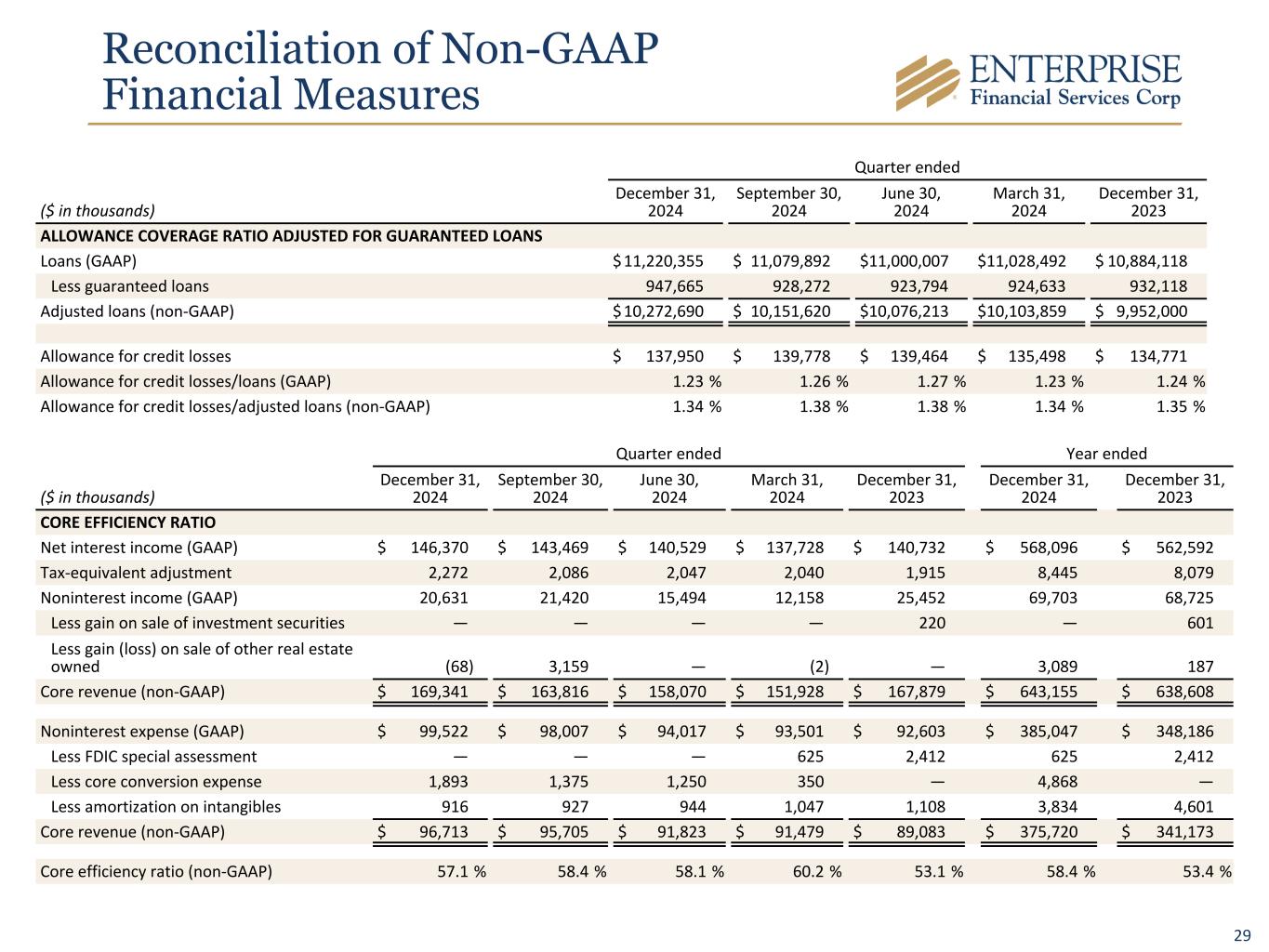 29 Reconciliation of Non-GAAP Financial Measures Quarter ended ($ in thousands) December 31, 2024 September 30, 2024 June 30, 2024 March 31, 2024 December 31, 2023 ALLOWANCE COVERAGE RATIO ADJUSTED FOR GUARANTEED LOANS Loans (GAAP) $ 11,220,355 $ 11,079,892 $ 11,000,007 $ 11,028,492 $ 10,884,118 Less guaranteed loans 947,665 928,272 923,794 924,633 932,118 Adjusted loans (non-GAAP) $ 10,272,690 $ 10,151,620 $ 10,076,213 $ 10,103,859 $ 9,952,000 Allowance for credit losses $ 137,950 $ 139,778 $ 139,464 $ 135,498 $ 134,771 Allowance for credit losses/loans (GAAP) 1.23 % 1.26 % 1.27 % 1.23 % 1.24 % Allowance for credit losses/adjusted loans (non-GAAP) 1.34 % 1.38 % 1.38 % 1.34 % 1.35 % Quarter ended Year ended ($ in thousands) December 31, 2024 September 30, 2024 June 30, 2024 March 31, 2024 December 31, 2023 December 31, 2024 December 31, 2023 CORE EFFICIENCY RATIO Net interest income (GAAP) $ 146,370 $ 143,469 $ 140,529 $ 137,728 $ 140,732 $ 568,096 $ 562,592 Tax-equivalent adjustment 2,272 2,086 2,047 2,040 1,915 8,445 8,079 Noninterest income (GAAP) 20,631 21,420 15,494 12,158 25,452 69,703 68,725 Less gain on sale of investment securities — — — — 220 — 601 Less gain (loss) on sale of other real estate owned (68) 3,159 — (2) — 3,089 187 Core revenue (non-GAAP) $ 169,341 $ 163,816 $ 158,070 $ 151,928 $ 167,879 $ 643,155 $ 638,608 Noninterest expense (GAAP) $ 99,522 $ 98,007 $ 94,017 $ 93,501 $ 92,603 $ 385,047 $ 348,186 Less FDIC special assessment — — — 625 2,412 625 2,412 Less core conversion expense 1,893 1,375 1,250 350 — 4,868 — Less amortization on intangibles 916 927 944 1,047 1,108 3,834 4,601 Core revenue (non-GAAP) $ 96,713 $ 95,705 $ 91,823 $ 91,479 $ 89,083 $ 375,720 $ 341,173 Core efficiency ratio (non-GAAP) 57.1 % 58.4 % 58.1 % 60.2 % 53.1 % 58.4 % 53.4 %