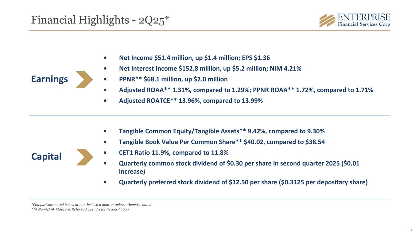 2 Some of the information in this report may contain “forward-looking statements” within the meaning of and intended to be covered by the safe harbor provisions of the Private Securities Litigation Reform Act of 1995. Such forward-looking statements may include projections based on management’s current expectations and beliefs concerning future developments and their potential effects on the Company including, without limitation, plans, strategies and goals, and statements about the Company’s expectations regarding revenue and asset growth, financial performance and profitability, loan and deposit growth, liquidity, yields and returns, loan diversification and credit management, stockholder value creation and the impact of acquisitions. Forward-looking statements are typically identified by words such as “believe,” “expect,” “anticipate,” “intend,” “outlook,” “estimate,” “forecast,” “project,” “pro forma,” “pipeline” and other similar words and expressions. Forward-looking statements are subject to numerous assumptions, risks and uncertainties, which change over time. Forward-looking statements speak only as of the date they are made. Because forward-looking statements are subject to assumptions and uncertainties, actual results or future events could differ, possibly materially, from those anticipated in the forward-looking statements and future results could differ materially from historical performance. They are neither statements of historical fact nor guarantees or assurances of future performance. While there is no assurance that any list of risks and uncertainties or risk factors is complete, important factors that could cause actual results to differ materially from those in the forward-looking statements include the following, without limitation: our ability to efficiently integrate acquisitions into our operations, retain the customers of these businesses and grow the acquired operations; credit risk; changes in the appraised valuation of real estate securing impaired loans; outcomes of litigation and other contingencies; exposure to general and local economic and market conditions, high unemployment rates, higher inflation and its impacts (including U.S. federal government measures to address higher inflation), impacts of trade and tariff policies, U.S. fiscal debt, budget and tax matters, and any slowdown in global economic growth; risks associated with rapid increases or decreases in prevailing interest rates; changes in business prospects that could impact goodwill estimates and assumptions; consolidation within the banking industry; competition from banks and other financial institutions; the ability to attract and retain relationship officers and other key personnel; burdens imposed by federal and state regulation; changes in legislative or regulatory requirements, as well as current, pending or future legislation or regulation that could have a negative effect on our revenue and business, including rules and regulations relating to bank products and financial services; changes in accounting policies and practices or accounting standards; natural disasters (including wildfires and earthquakes); terrorist activities, war and geopolitical matters (including the war in Israel and potential for a broader regional conflict and the war in Ukraine and the imposition of additional sanctions and export controls in connection therewith), or pandemics, or other health emergencies and their effects on economic and business environments in which we operate, including the related disruption to the financial market and other economic activity; and other risks referenced from time to time in the Company’s filings with the Securities and Exchange Commission (the “SEC”), including in the Company’s Annual Report on Form 10-K for the fiscal year ended December 31, 2024, and the Company’s other filings with the SEC. The Company cautions that the preceding list is not exhaustive of all possible risk factors and other factors could also adversely affect the Company’s results. For any forward-looking statements made in this press release or in any documents, EFSC claims the protection of the safe harbor for forward-looking statements contained in the Private Securities Litigation Reform Act of 1995. Annualized, pro forma, projected and estimated numbers in this document are used for illustrative purposes only, are not forecasts and may not reflect actual results. Readers are cautioned not to place undue reliance on any forward-looking statements. Except to the extent required by applicable law or regulation, EFSC disclaims any obligation to revise or publicly release any revision or update to any of the forward-looking statements included herein to reflect events or circumstances that occur after the date on which such statements were made. Forward-Looking Statements