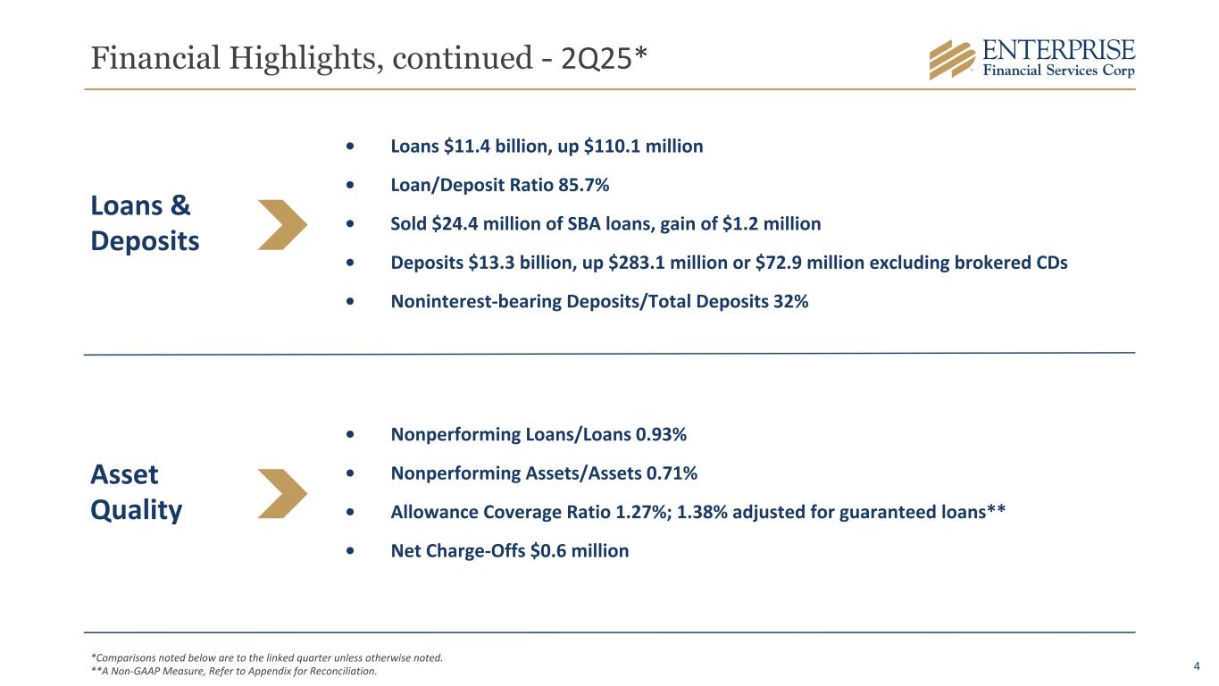3 Financial Highlights - 2Q25* Capital • Tangible Common Equity/Tangible Assets** 9.42%, compared to 9.30% • Tangible Book Value Per Common Share** $40.02, compared to $38.54 • CET1 Ratio 11.9%, compared to 11.8% • Quarterly common stock dividend of $0.30 per share in second quarter 2025 ($0.01 increase) • Quarterly preferred stock dividend of $12.50 per share ($0.3125 per depositary share) • Net Income $51.4 million, up $1.4 million; EPS $1.36 • Net Interest Income $152.8 million, up $5.2 million; NIM 4.21% • PPNR** $68.1 million, up $2.0 million • Adjusted ROAA** 1.31%, compared to 1.29%; PPNR ROAA** 1.72%, compared to 1.71% • Adjusted ROATCE** 13.96%, compared to 13.99% Earnings *Comparisons noted below are to the linked quarter unless otherwise noted. **A Non-GAAP Measure, Refer to Appendix for Reconciliation.
