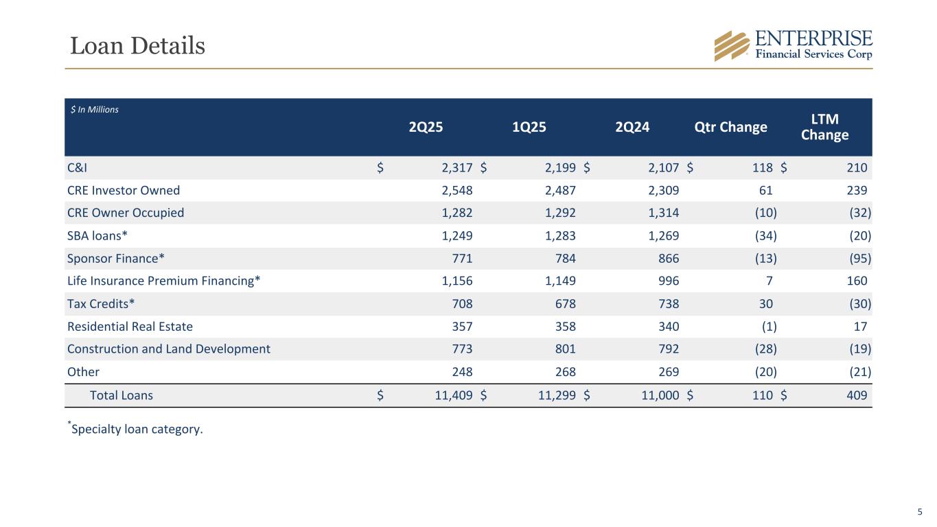 4 Financial Highlights, continued - 2Q25* *Comparisons noted below are to the linked quarter unless otherwise noted. **A Non-GAAP Measure, Refer to Appendix for Reconciliation. Loans & Deposits • Loans $11.4 billion, up $110.1 million • Loan/Deposit Ratio 85.7% • Sold $24.4 million of SBA loans, gain of $1.2 million • Deposits $13.3 billion, up $283.1 million or $72.9 million excluding brokered CDs • Noninterest-bearing Deposits/Total Deposits 32% Asset Quality • Nonperforming Loans/Loans 0.93% • Nonperforming Assets/Assets 0.71% • Allowance Coverage Ratio 1.27%; 1.38% adjusted for guaranteed loans** • Net Charge-Offs $0.6 million