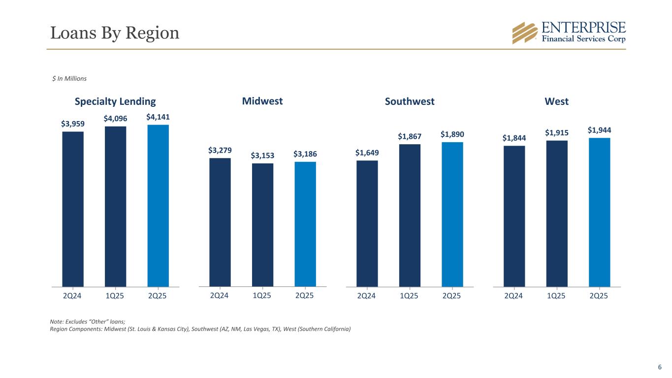 5 Loan Details 2Q25 1Q25 2Q24 Qtr Change LTM Change C&I $ 2,317 $ 2,199 $ 2,107 $ 118 $ 210 CRE Investor Owned 2,548 2,487 2,309 61 239 CRE Owner Occupied 1,282 1,292 1,314 (10) (32) SBA loans* 1,249 1,283 1,269 (34) (20) Sponsor Finance* 771 784 866 (13) (95) Life Insurance Premium Financing* 1,156 1,149 996 7 160 Tax Credits* 708 678 738 30 (30) Residential Real Estate 357 358 340 (1) 17 Construction and Land Development 773 801 792 (28) (19) Other 248 268 269 (20) (21) Total Loans $ 11,409 $ 11,299 $ 11,000 $ 110 $ 409 *Specialty loan category. $ In Millions