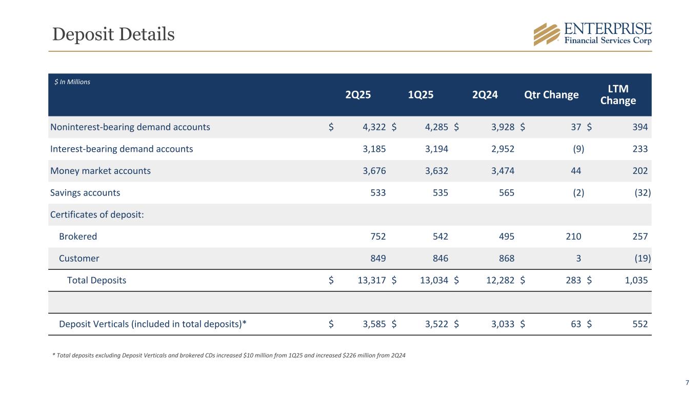 6 Loans By Region Specialty Lending $3,959 $4,096 $4,141 2Q24 1Q25 2Q25 $ In Millions Midwest $3,279 $3,153 $3,186 2Q24 1Q25 2Q25 Southwest $1,649 $1,867 $1,890 2Q24 1Q25 2Q25 Note: Excludes “Other” loans; Region Components: Midwest (St. Louis & Kansas City), Southwest (AZ, NM, Las Vegas, TX), West (Southern California) West $1,844 $1,915 $1,944 2Q24 1Q25 2Q25