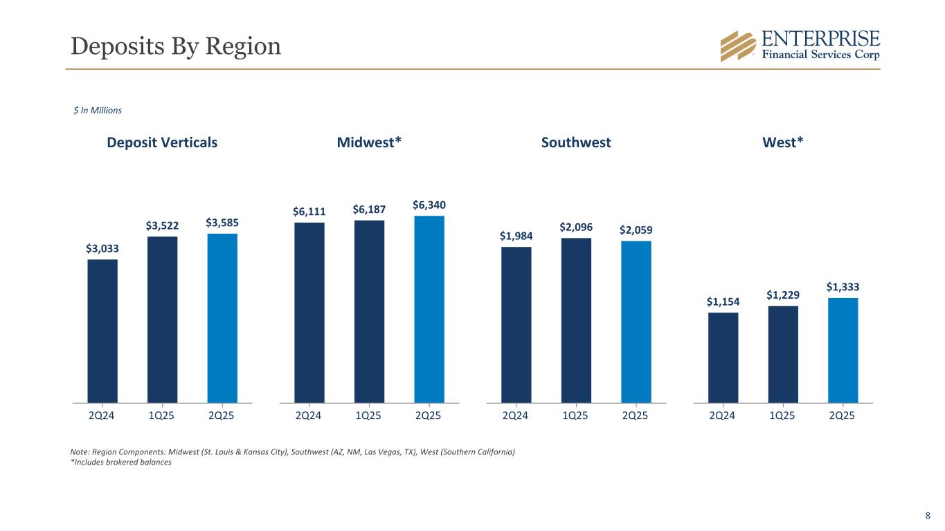 7 Deposit Details 2Q25 1Q25 2Q24 Qtr Change LTM Change Noninterest-bearing demand accounts $ 4,322 $ 4,285 $ 3,928 $ 37 $ 394 Interest-bearing demand accounts 3,185 3,194 2,952 (9) 233 Money market accounts 3,676 3,632 3,474 44 202 Savings accounts 533 535 565 (2) (32) Certificates of deposit: Brokered 752 542 495 210 257 Customer 849 846 868 3 (19) Total Deposits $ 13,317 $ 13,034 $ 12,282 $ 283 $ 1,035 Deposit Verticals (included in total deposits)* $ 3,585 $ 3,522 $ 3,033 $ 63 $ 552 $ In Millions * Total deposits excluding Deposit Verticals and brokered CDs increased $10 million from 1Q25 and increased $226 million from 2Q24
