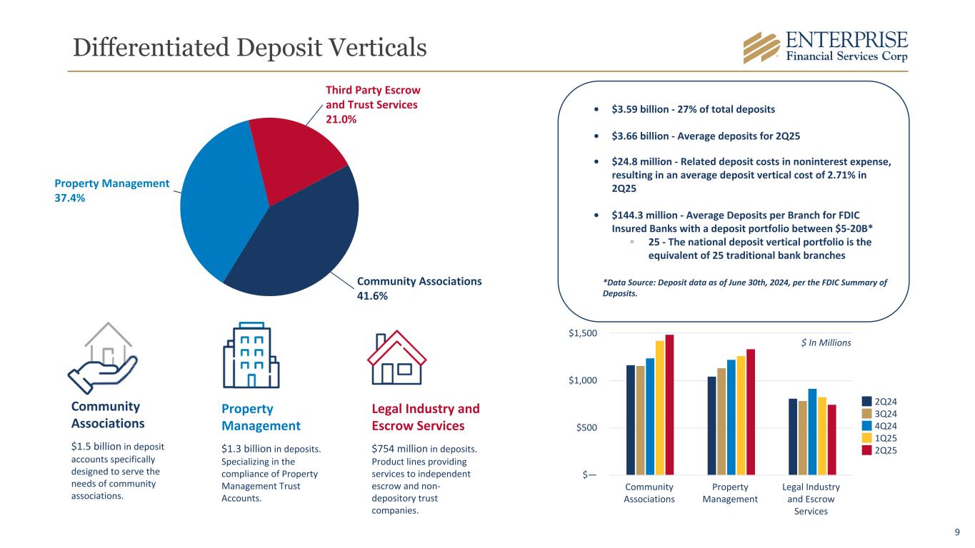8 Deposits By Region Deposit Verticals $3,033 $3,522 $3,585 2Q24 1Q25 2Q25 $ In Millions Note: Region Components: Midwest (St. Louis & Kansas City), Southwest (AZ, NM, Las Vegas, TX), West (Southern California) *Includes brokered balances Midwest* $6,111 $6,187 $6,340 2Q24 1Q25 2Q25 West* $1,154 $1,229 $1,333 2Q24 1Q25 2Q25 Southwest $1,984 $2,096 $2,059 2Q24 1Q25 2Q25