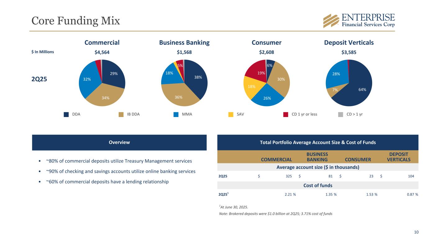 9 Differentiated Deposit Verticals Community Associations 41.6% Property Management 37.4% Third Party Escrow and Trust Services 21.0% Community Associations $1.5 billion in deposit accounts specifically designed to serve the needs of community associations. Property Management $1.3 billion in deposits. Specializing in the compliance of Property Management Trust Accounts. Legal Industry and Escrow Services $754 million in deposits. Product lines providing services to independent escrow and non- depository trust companies. • $3.59 billion - 27% of total deposits • $3.66 billion - Average deposits for 2Q25 • $24.8 million - Related deposit costs in noninterest expense, resulting in an average deposit vertical cost of 2.71% in 2Q25 • $144.3 million - Average Deposits per Branch for FDIC Insured Banks with a deposit portfolio between $5-20B* ◦ 25 - The national deposit vertical portfolio is the equivalent of 25 traditional bank branches *Data Source: Deposit data as of June 30th, 2024, per the FDIC Summary of Deposits. 2Q24 3Q24 4Q24 1Q25 2Q25 Community Associations Property Management Legal Industry and Escrow Services $— $500 $1,000 $1,500 $ In Millions