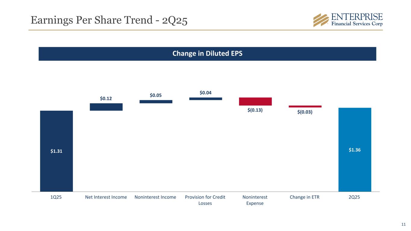 10 Core Funding Mix Commercial Business Banking Consumer $ In Millions 1At June 30, 2025. Note: Brokered deposits were $1.0 billion at 2Q25; 3.71% cost of funds Deposit Verticals 2Q25 Total Portfolio Average Account Size & Cost of Funds COMMERCIAL BUSINESS BANKING CONSUMER DEPOSIT VERTICALS Average account size ($ in thousands) 2Q25 $ 325 $ 81 $ 23 $ 104 Cost of funds 2Q251 2.21 % 1.35 % 1.53 % 0.87 % • ~80% of commercial deposits utilize Treasury Management services • ~90% of checking and savings accounts utilize online banking services • ~60% of commercial deposits have a lending relationship Overview 29% 34% 32% 38% 36% 18% 5% 6% 30% 26% 18% 19% 64%7% 28% $4,564 $3,585$2,608$1,568 DDA IB DDA MMA SAV CD 1 yr or less CD > 1 yr