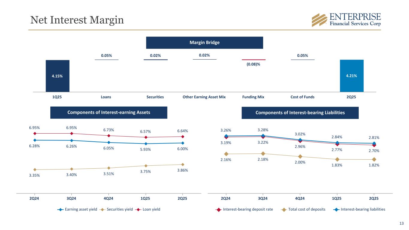 12 $140.5 $143.5 $146.4 $147.5 $152.8 4.19% 4.17% 4.13% 4.15% 4.21% 5.33% 5.27% 4.66% 4.33% 4.33% Net Interest Income Net Interest Margin Avg Fed Funds Rate 2Q24 3Q24 4Q24 1Q25 2Q25 Net Interest Income Trend $ In Millions Net Interest Income 2Q24 3Q24 4Q24 1Q25 2Q25 Net Interest Income - FTE $ 142.6 $ 145.6 $ 148.6 $ 150.0 $ 155.5 Purchase Accounting Amortization/(Accretion) (0.2) 0.5 0.8 0.2 0.4 Adjusted Net Interest Income - FTE (Excluding Purchase Accounting) $ 142.4 $ 146.1 $ 149.4 $ 150.2 $ 155.9 Net Interest Margin 4.19 % 4.17 % 4.13 % 4.15 % 4.21 % Purchase Accounting Amortization/(Accretion) — % 0.01 % 0.02 % 0.01 % 0.01 % Adjusted Net Interest Income - FTE (Excluding Purchase Accounting) 4.19 % 4.18 % 4.15 % 4.16 % 4.22 %