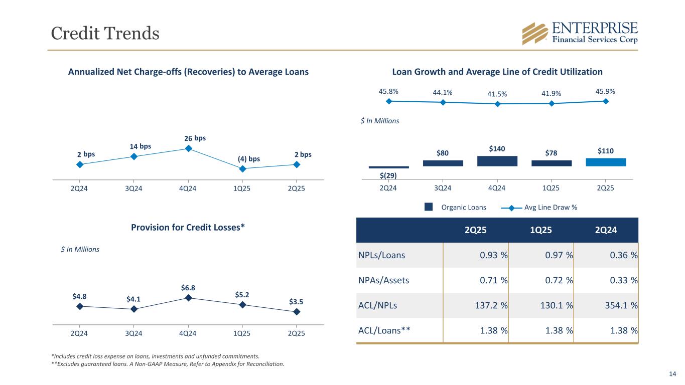 13 Net Interest Margin 6.95% 6.95% 6.73% 6.57% 6.64% 3.35% 3.40% 3.51% 3.75% 3.86% 6.28% 6.26% 6.05% 5.93% 6.00% Earning asset yield Securities yield Loan yield 2Q24 3Q24 4Q24 1Q25 2Q25 3.19% 3.22% 2.96% 2.77% 2.70% 2.16% 2.18% 2.00% 1.83% 1.82% 3.26% 3.28% 3.02% 2.84% 2.81% Interest-bearing deposit rate Total cost of deposits Interest-bearing liabilities 2Q24 3Q24 4Q24 1Q25 2Q25 Components of Interest-bearing LiabilitiesComponents of Interest-earning Assets 4.15% 0.05% 0.02% 0.02% (0.08)% 0.05% 4.21% 1Q25 Loans Securities Other Earning Asset Mix Funding Mix Cost of Funds 2Q25 Margin Bridge