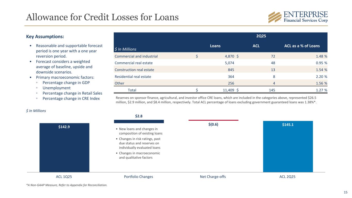 14 2 14 26 (4) 2 2Q24 3Q24 4Q24 1Q25 2Q25 $(29) $80 $140 $78 $110 45.8% 44.1% 41.5% 41.9% 45.9% Organic Loans Avg Line Draw % 2Q24 3Q24 4Q24 1Q25 2Q25 2Q25 1Q25 2Q24 NPLs/Loans 0.93 % 0.97 % 0.36 % NPAs/Assets 0.71 % 0.72 % 0.33 % ACL/NPLs 137.2 % 130.1 % 354.1 % ACL/Loans** 1.38 % 1.38 % 1.38 % Annualized Net Charge-offs (Recoveries) to Average Loans Provision for Credit Losses* $4.8 $4.1 $6.8 $5.2 $3.5 2Q24 3Q24 4Q24 1Q25 2Q25 $ In Millions bps bps bps bps bps $ In Millions Loan Growth and Average Line of Credit Utilization *Includes credit loss expense on loans, investments and unfunded commitments. **Excludes guaranteed loans. A Non-GAAP Measure, Refer to Appendix for Reconciliation. Credit Trends