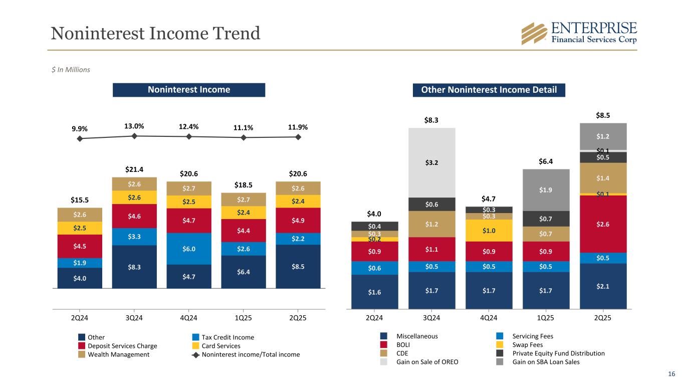 15 $142.9 $2.8 $(0.6) $145.1 ACL 1Q25 Portfolio Changes Net Charge-offs ACL 2Q25 Allowance for Credit Losses for Loans $ In Millions • New loans and changes in composition of existing loans • Changes in risk ratings, past due status and reserves on individually evaluated loans • Changes in macroeconomic and qualitative factors $ In Millions 2Q25 Loans ACL ACL as a % of Loans Commercial and industrial $ 4,870 $ 72 1.48 % Commercial real estate 5,074 48 0.95 % Construction real estate 845 13 1.54 % Residential real estate 364 8 2.20 % Other 256 4 1.56 % Total $ 11,409 $ 145 1.27 % Reserves on sponsor finance, agricultural, and investor office CRE loans, which are included in the categories above, represented $26.5 million, $2.9 million, and $8.4 million, respectively. Total ACL percentage of loans excluding government guaranteed loans was 1.38%*. Key Assumptions: • Reasonable and supportable forecast period is one year with a one year reversion period. • Forecast considers a weighted average of baseline, upside and downside scenarios. • Primary macroeconomic factors: ◦ Percentage change in GDP ◦ Unemployment ◦ Percentage change in Retail Sales ◦ Percentage change in CRE Index *A Non-GAAP Measure, Refer to Appendix for Reconciliation.