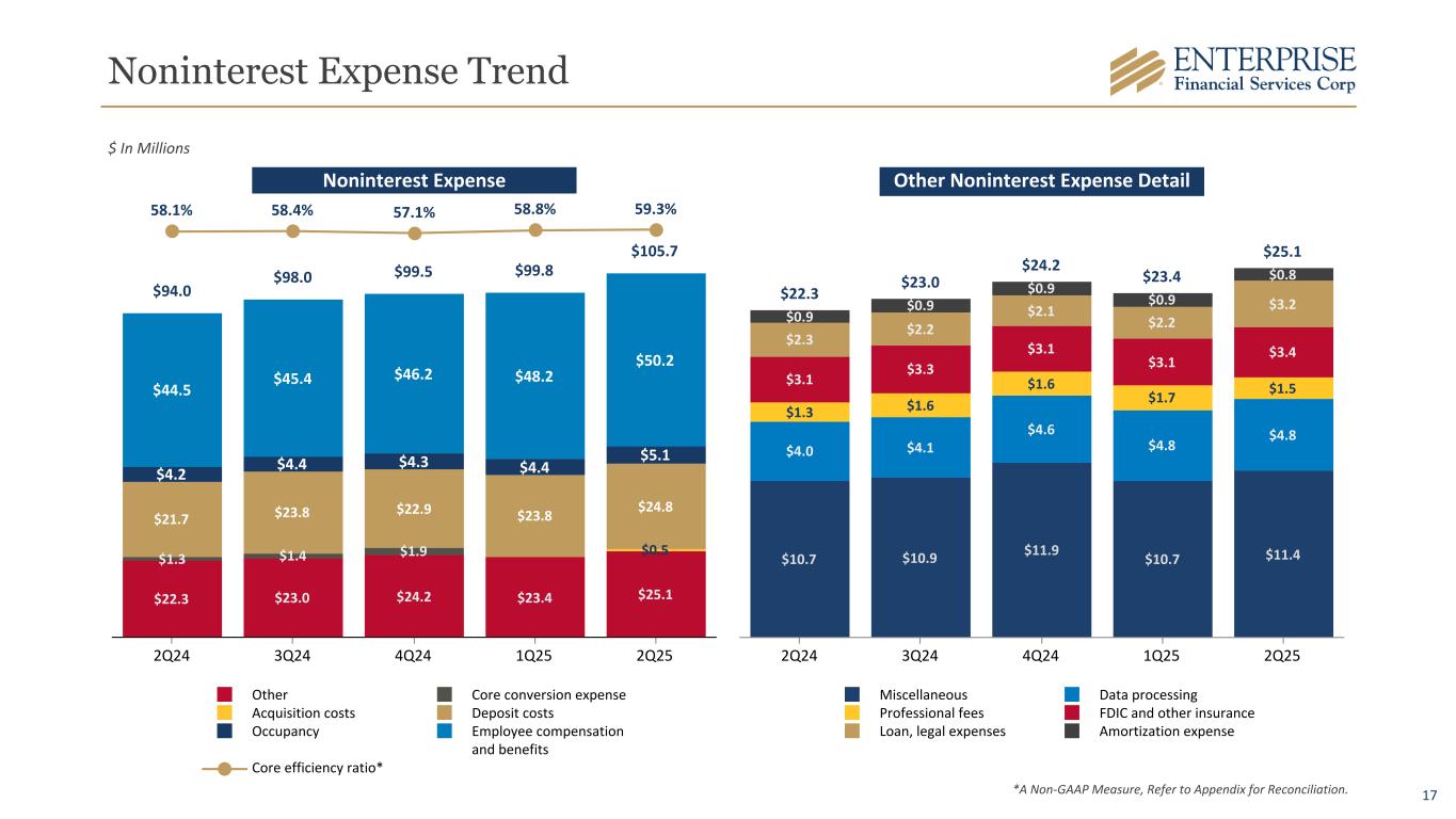 16 Noninterest Income Trend $15.5 $21.4 $20.6 $18.5 $20.6 $4.0 $8.3 $4.7 $6.4 $8.5$1.9 $3.3 $6.0 $2.6 $2.2 $4.5 $4.6 $4.7 $4.4 $4.9 $2.5 $2.6 $2.5 $2.4 $2.4 $2.6 $2.6 $2.7 $2.7 $2.6 9.9% 13.0% 12.4% 11.1% 11.9% Other Tax Credit Income Deposit Services Charge Card Services Wealth Management Noninterest income/Total income 2Q24 3Q24 4Q24 1Q25 2Q25 $4.0 $8.3 $4.7 $6.4 $8.5 $1.6 $1.7 $1.7 $1.7 $2.1 $0.6 $0.5 $0.5 $0.5 $0.5 $0.9 $1.1 $0.9 $0.9 $2.6 $0.2 $1.0 $0.1 $0.3 $1.2 $0.3 $0.7 $1.4 $0.4 $0.6 $0.3 $0.7 $0.5 $3.2 $0.1 $1.9 $1.2 Miscellaneous Servicing Fees BOLI Swap Fees CDE Private Equity Fund Distribution Gain on Sale of OREO Gain on SBA Loan Sales 2Q24 3Q24 4Q24 1Q25 2Q25 $ In Millions Noninterest Income Other Noninterest Income Detail