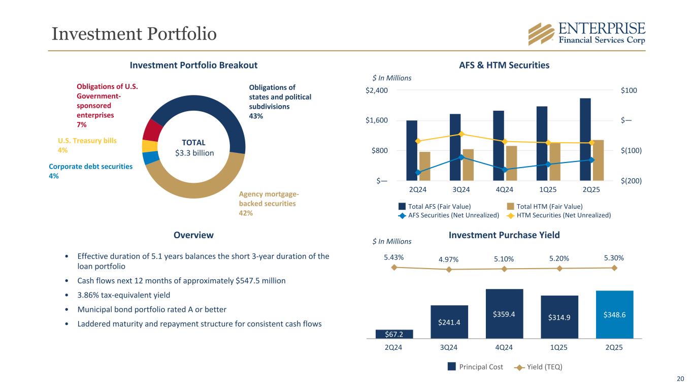 18 Capital Tangible Common Equity/Tangible Assets 9.18% 9.50% 9.05% 9.30% 9.42% Tangible Common Equity/Tangible Assets* 2Q24 3Q24 4Q24 1Q25 2Q25 *A Non-GAAP Measure, Refer to Appendix for Reconciliation. **Preliminary regulatory capital ratios. Regulatory Capital 10.0% 14.6% 14.8% 14.6% 14.7% 14.7% 6.5% 11.7% 11.9% 11.8% 11.8% 11.9% CET1 Tier 1 Total Risk Based Capital Minimum "Well Capitalized" Ratio 2Q24 3Q24 4Q24 1Q25 2Q25 8.0% 13.0% 13.2% 13.1% 13.1% EFSC Capital Strategy: Low Cost - Highly Flexible High Capital Retention Rate – Strong earnings profile – Sustainable dividend profile Supporting Robust Asset Growth – Organic loan and deposit growth – High quality M&A to enhance commercial franchise and geographic diversification Maintain High Quality Capital Stack – Minimize WACC over time (preferred, sub debt, etc.) – Optimize capital levels CET1 ~10%, Tier 1 ~12%, and Total Capital ~14% Maintain 8-9% TCE – M&A deal structures – Drives ROATCE above peer levels TBV and Dividends per Share $35.02 $37.26 $37.27 $38.54 $40.02 $0.26 $0.27 $0.28 $0.29 $0.30 TBV/Share* Dividends per Share 2Q24 3Q24 4Q24 1Q25 2Q25 13.2% **